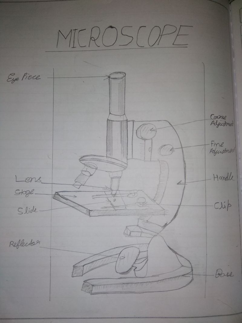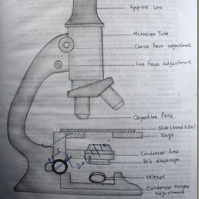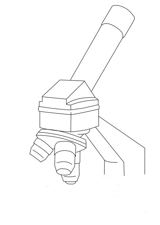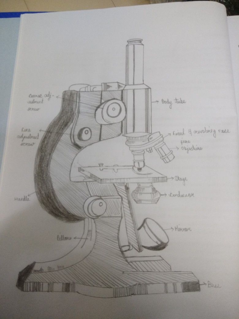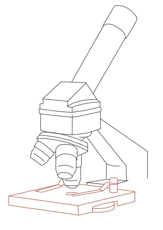 Рисуването започва с приблизително разпределение или оформление на основните части на инструмента върху лист хартия. Важно е веднага да се определи правилният ъгъл на рисунката и да се скицира микроскопът с молив строго в профил или с такъв наклон, че обектът да се вижда, т.е. да се гледа масата леко отгоре.