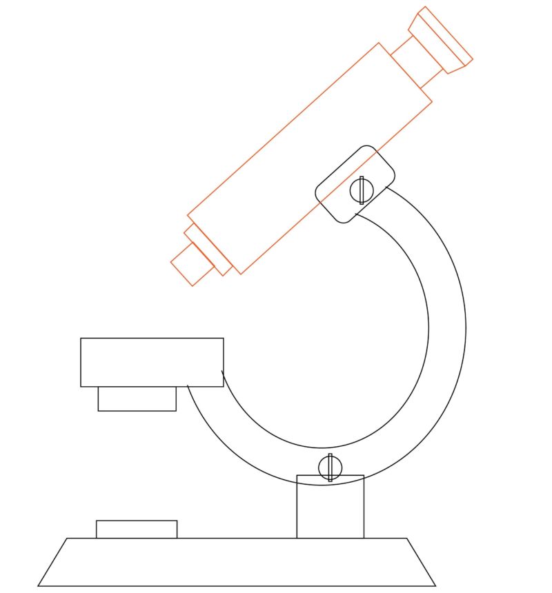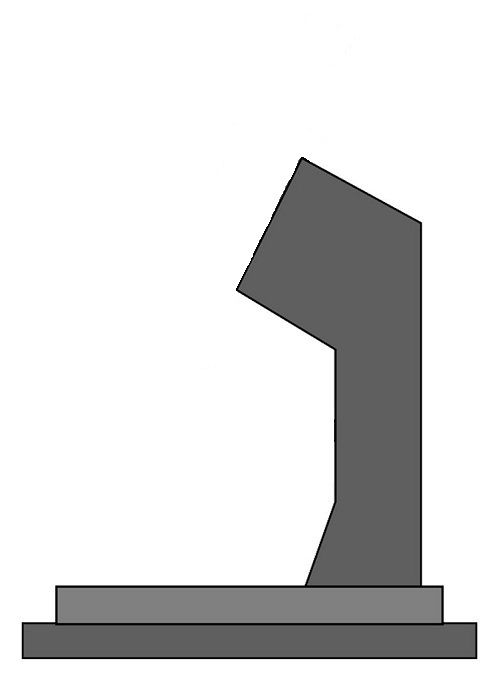 Ако погледнете микроскопа отгоре, стойката ще се вижда като квадрат или овал, частично невидим заради детайлите отгоре. Остава да допълним чертежа с Г-образна скоба с копче за регулиране на височината на окуляра.