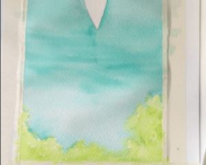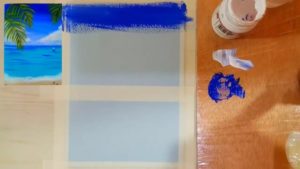 - Покрийте долната част на листа със синя боя, като движите четката от единия до другия край. Добавете тук бледосин слой. Смесете зелена боя с жълта, като добавите малко бяла боя, за да подчертаете основата на вълната.