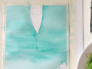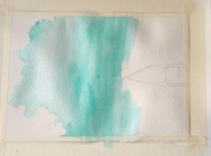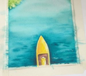 - Намокрете с чиста четка избраната за морска зона област. Покрийте водата по ръба на брега с разредена охра, след което използвайте светъл тюркоазен цвят. По-далеч от брега използвайте ярко синьо и ултрамарин. Използвайте същия цвят, но по-наситен, за да нарисувате останалата част от морето-океан. Колкото по-близо е до хоризонта, толкова по-тъмна е водата.