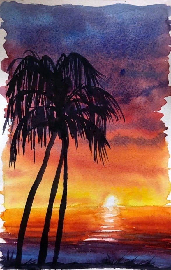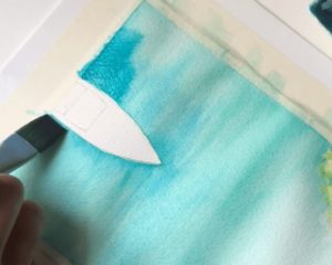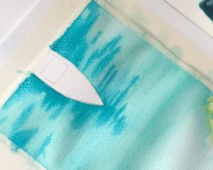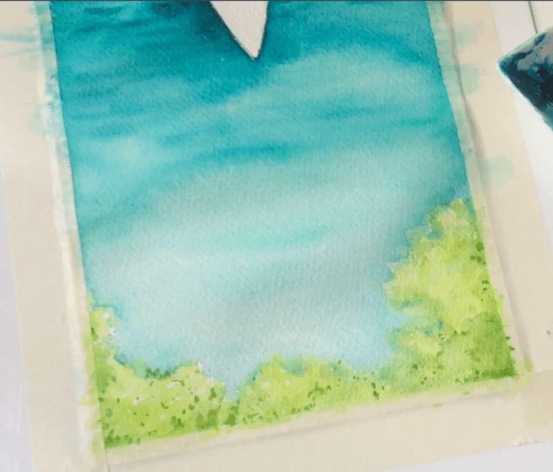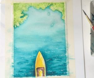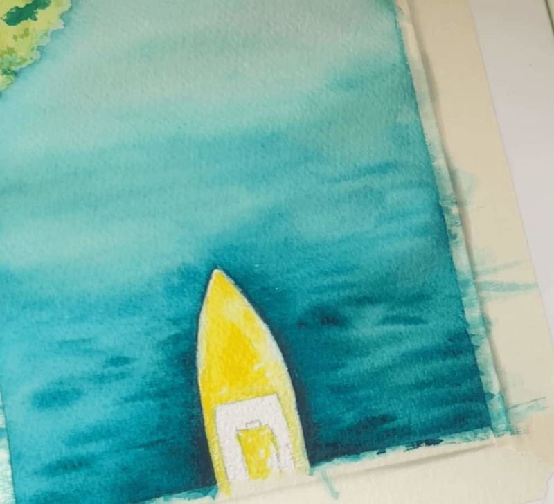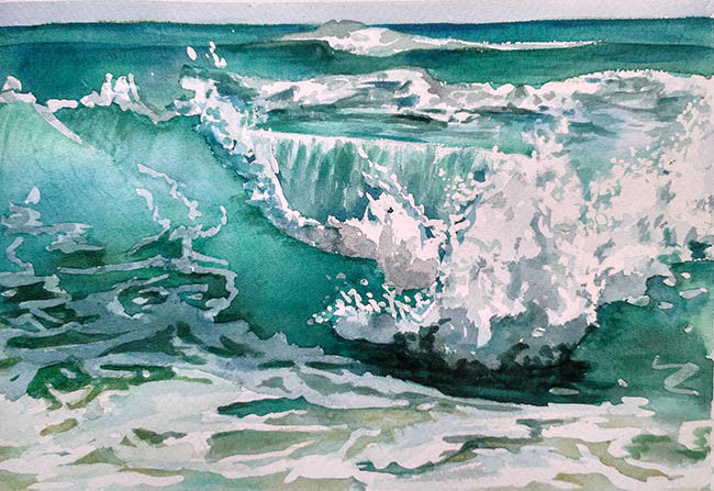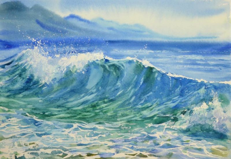 - За да създадете впечатлението за искряща вода, размажете някои части на вълните или не боядисайте предварително добре листа, като оставите малки бели петна. Естествената белота на хартиената подложка спомага за постигане на игра на светлината.