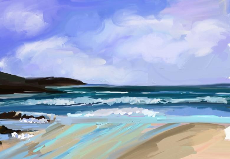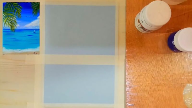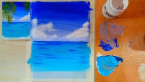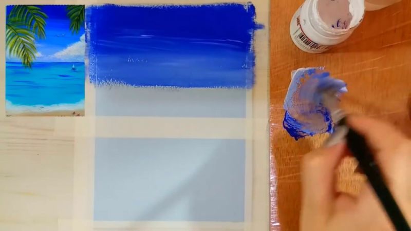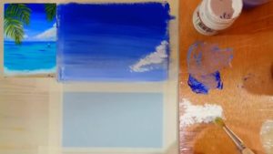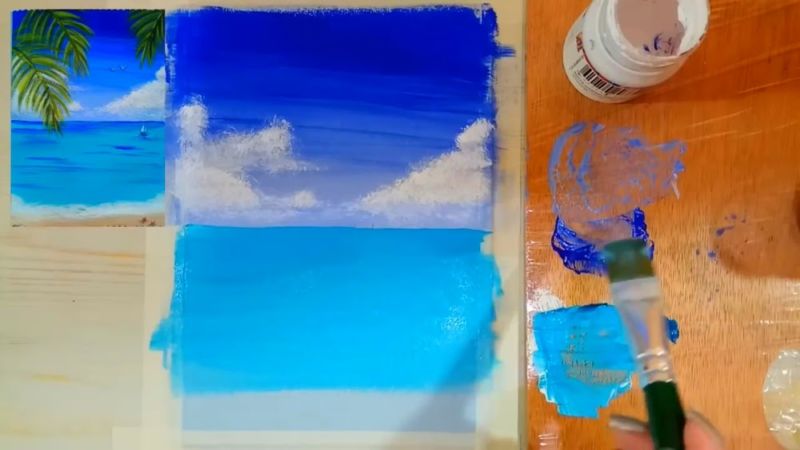 След това с пръст се нанася двоен слой паста отгоре, като се подчертават облаците в горната част. По същия начин по крайбрежието се образува морска пяна.