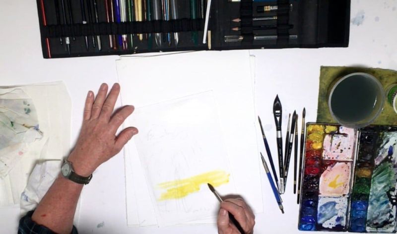 Ако искате да рисувате с цвят наведнъж, използвайте техниката за рисуване без контур. Акварелът не обича грешките, но ви позволява да работите със спираща дъха скорост. За да се премахне неволно нанесената боя или да се създадат акценти, определени зони се измиват с чиста, мокра четка или гъба.