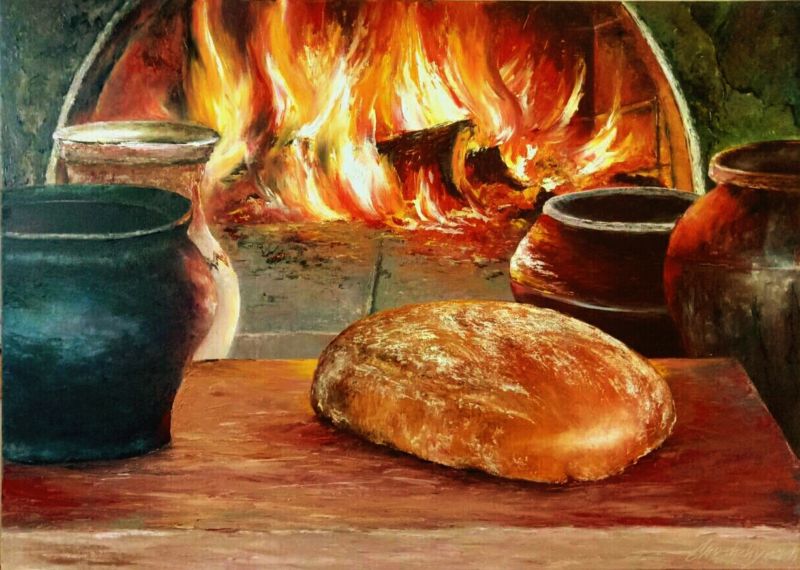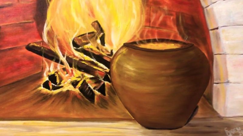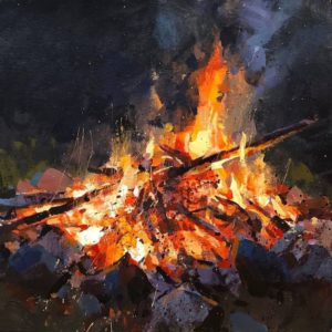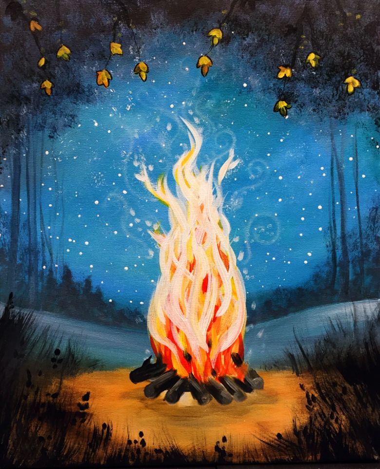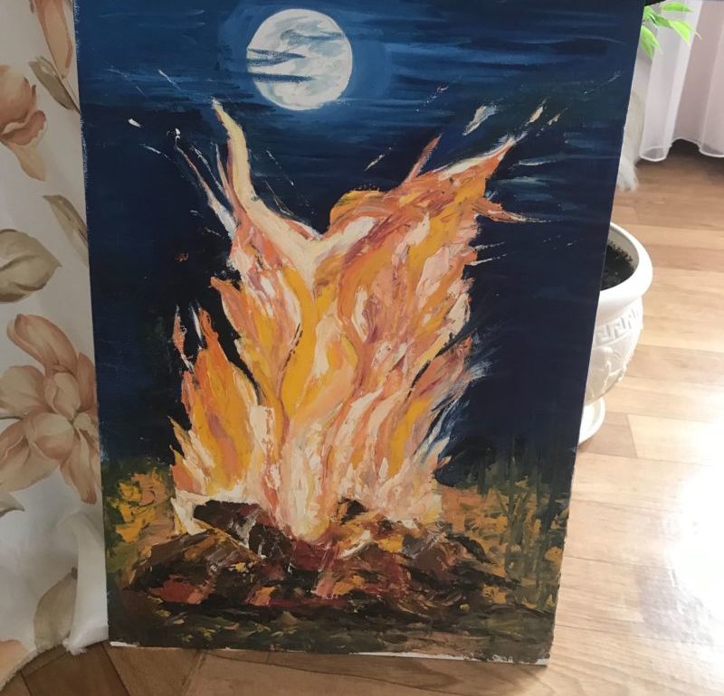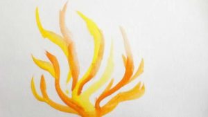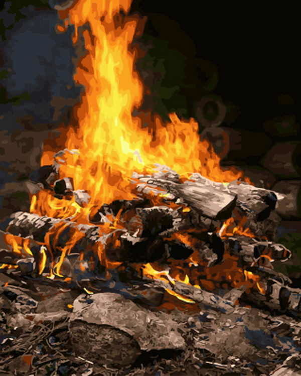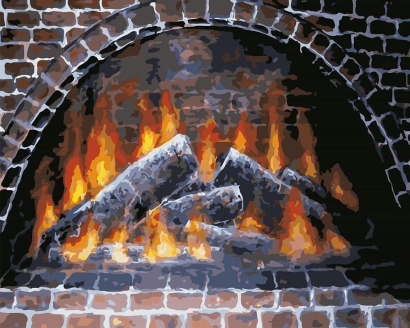 Най-светлото петно ще бъде мястото непосредствено над дървата за огрев, което може да се остави бяло за повече контраст, а над него се изобразява интензивно жълтата среда на пламъците.