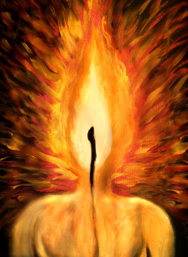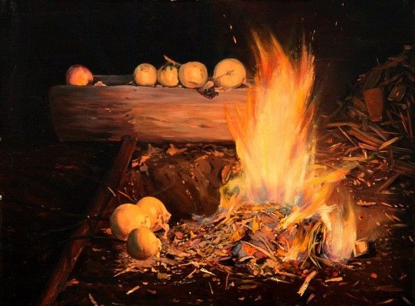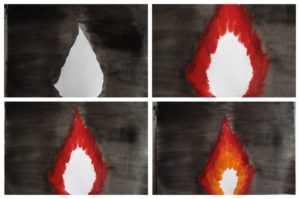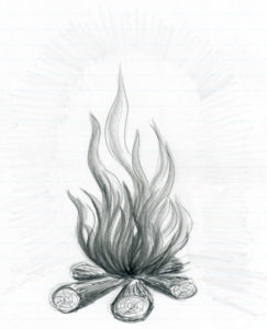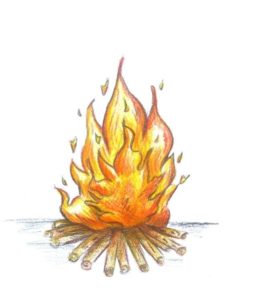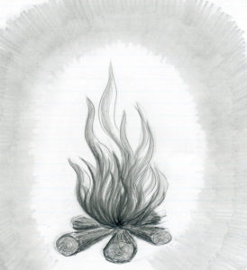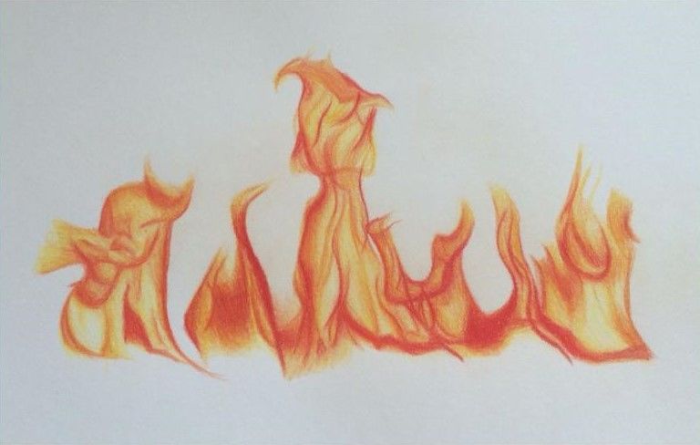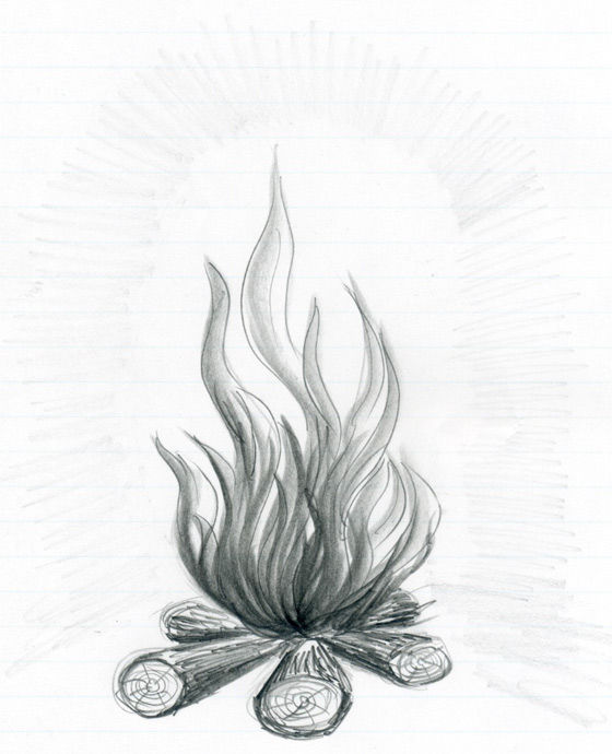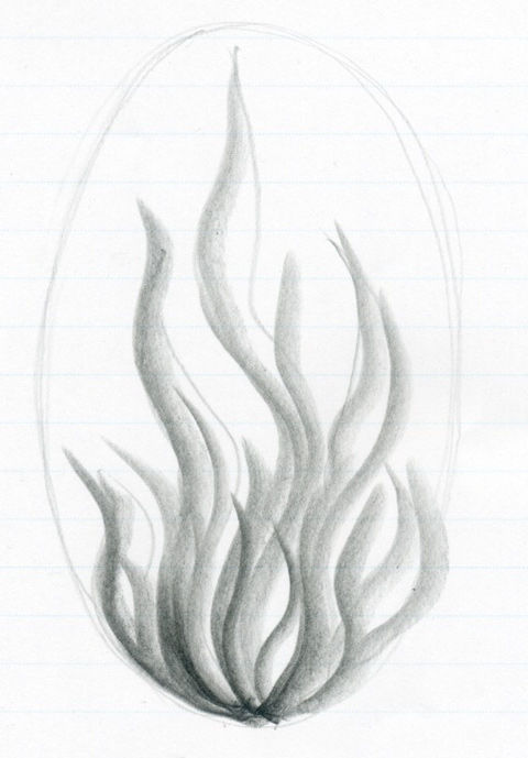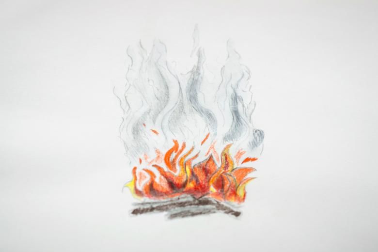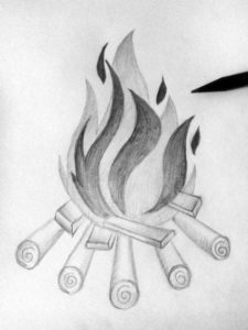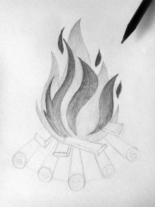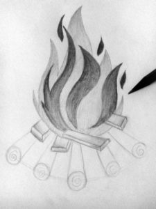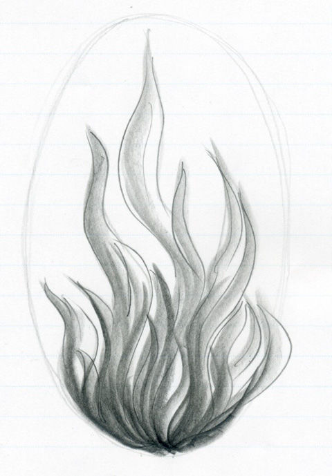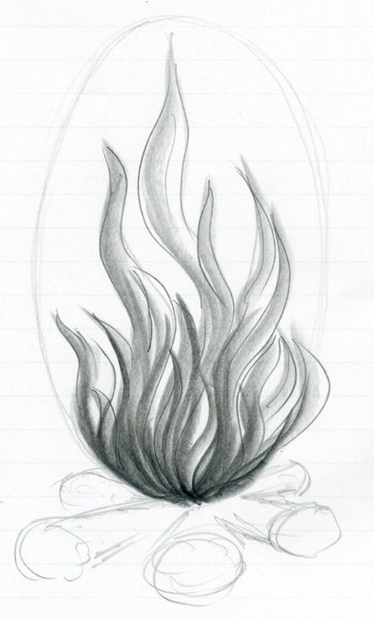 - Мекият молив очертава контурите на огъня, като най-тъмните и резки линии и почти бялото светло петно са поставени на преден план, за да създадат перспектива. Острите краища на езиците на пламъка могат да бъдат леко удължени с искри, изобразени с фини движения.