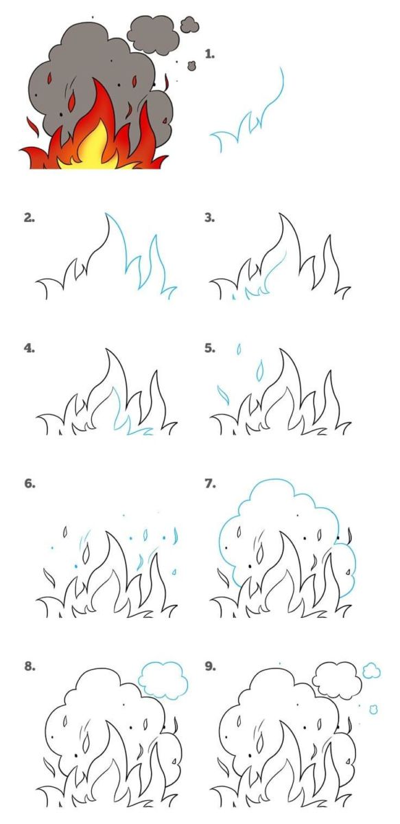 За да се изобрази задоволително пламъкът в рисунките, човек трябва да се въоръжи с теоретични познания, тъй като дори да може да наблюдава жив огън, е трудно да го нарисува на живо, особено за неопитните художници.