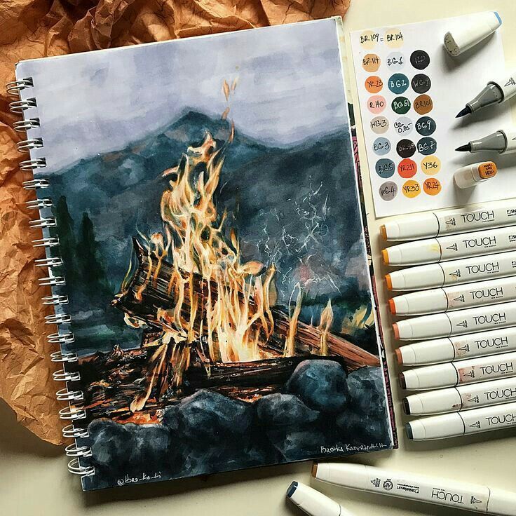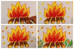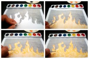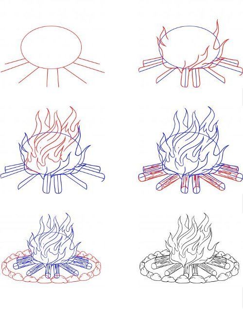 Често се налага да рисувате огън стъпка по стъпка с дърва, когато децата и младите художници са заети да създават цели серии от картини и комикси.
