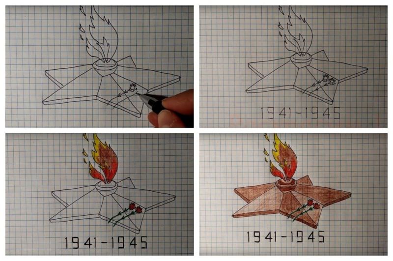 На лист хартия трябва да се нарисува петолъчна звезда, като предната част се вижда на окончателния чертеж, а задната е покрита с пламъци. За по-голяма яснота звездата трябва да бъде нарисувана изцяло, така че да изглежда възможно най-реалистично и правилно.