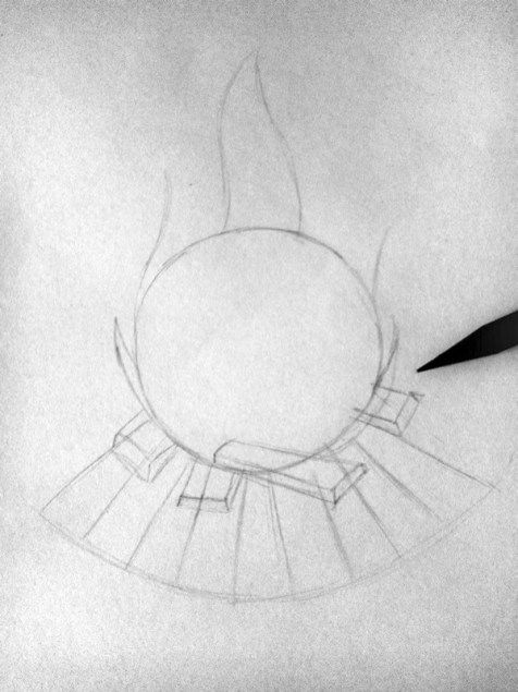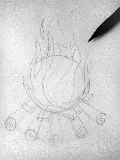 Върху лист хартия, на мястото, където се предполага, че ще бъде нарисуван огънят, трябва да се начертае голям кръг с компас. Вътре в кръга нарисувайте няколко езика на пламъка с различна форма и височина, така че най-високият да е в средата.