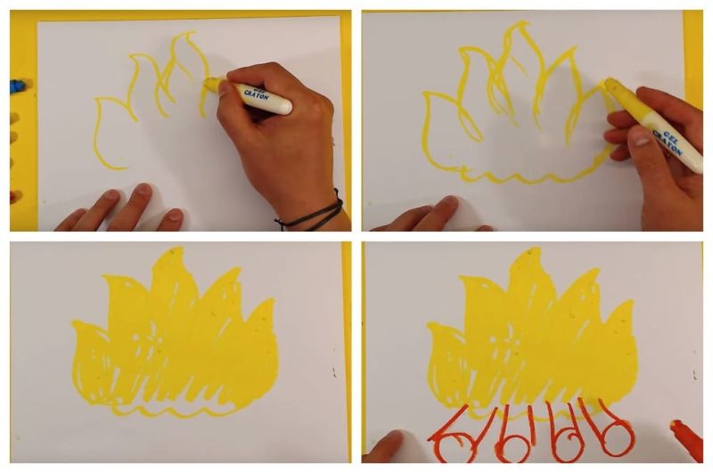 Пламъците са нарисувани в плавни линии, като всяко парче огън се стеснява нагоре. Рисунката трябва да има поне два цвята или тона, които да представят движещите се светкавици.