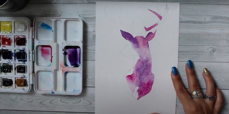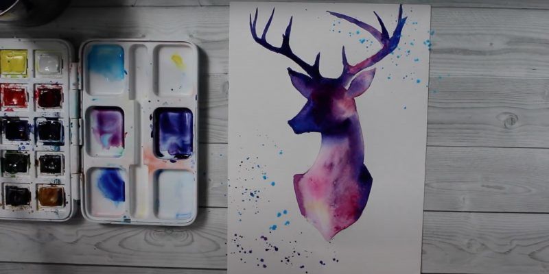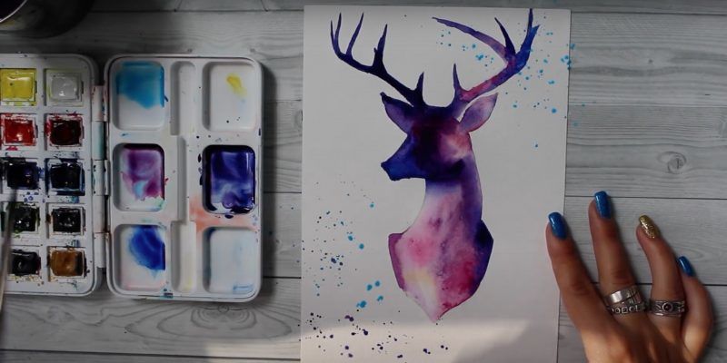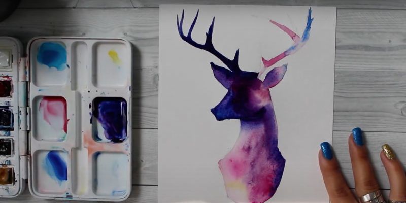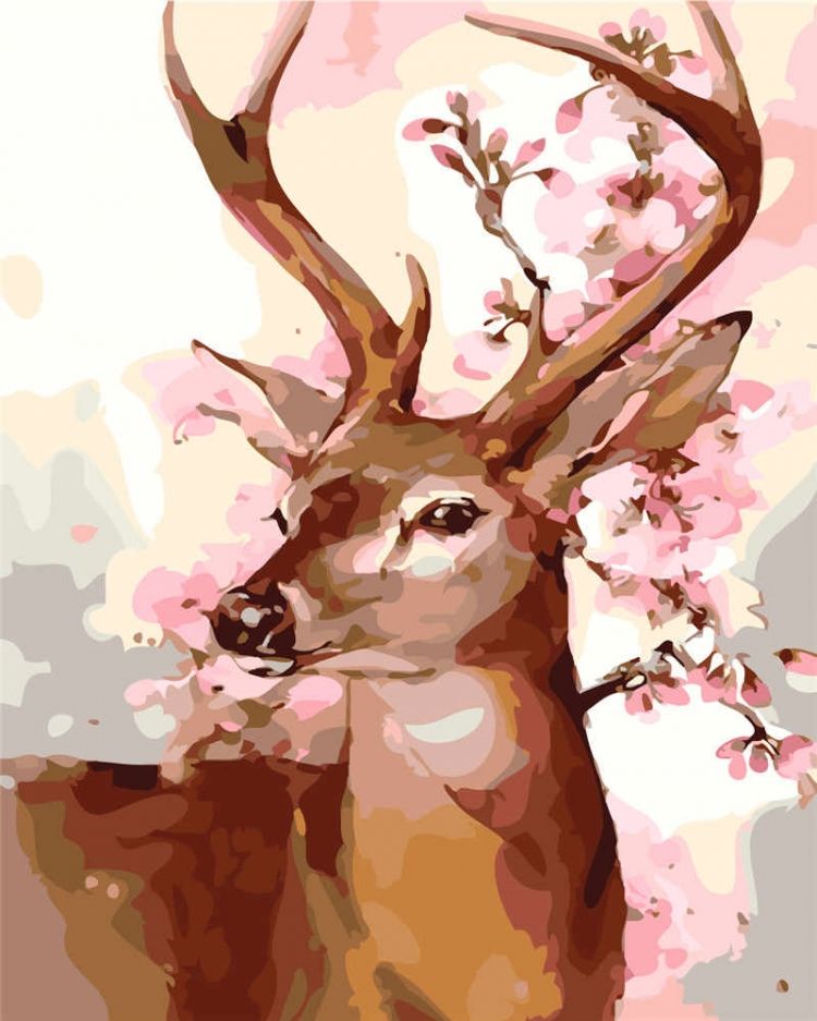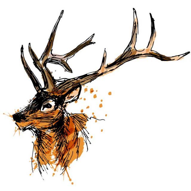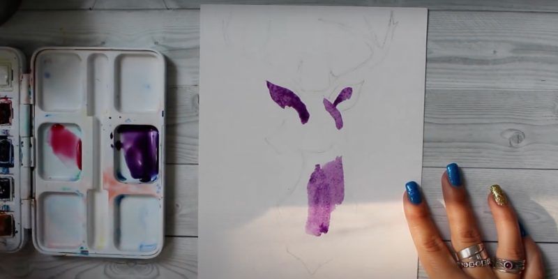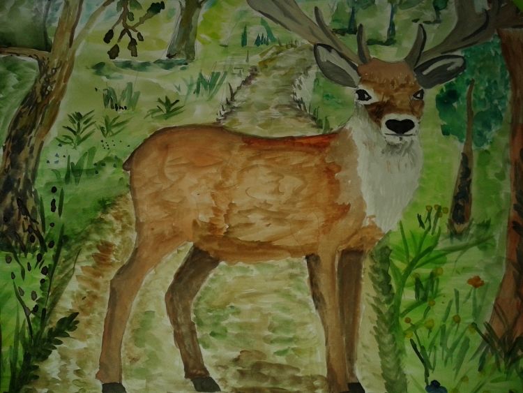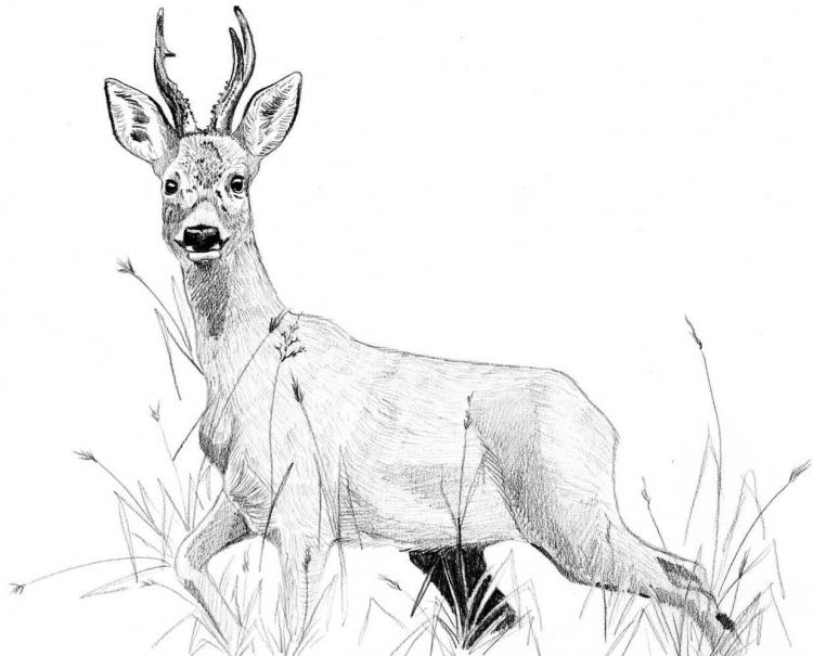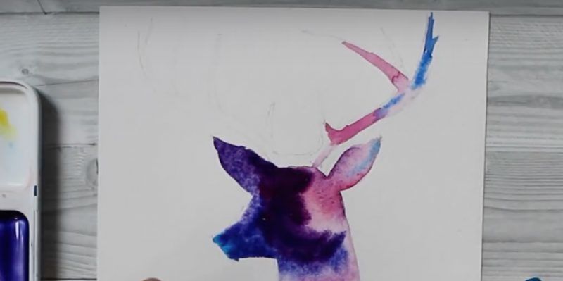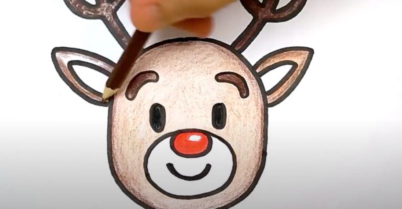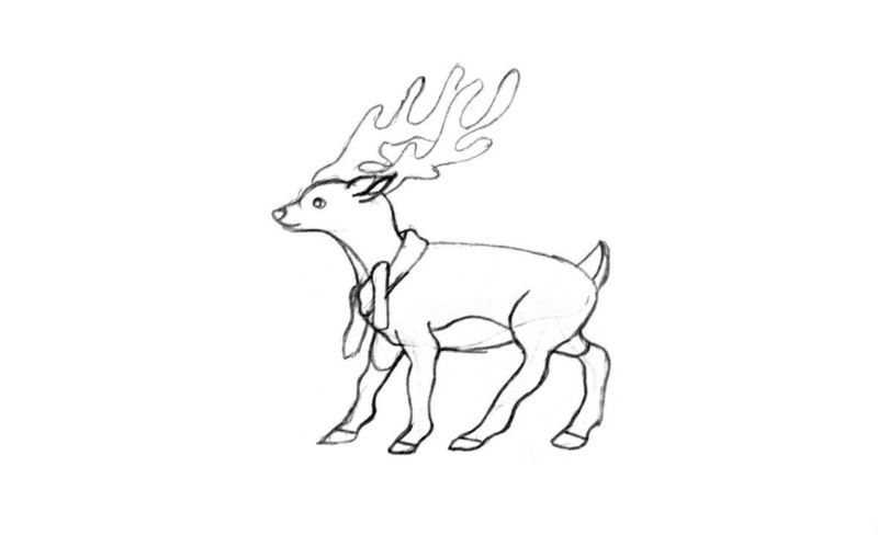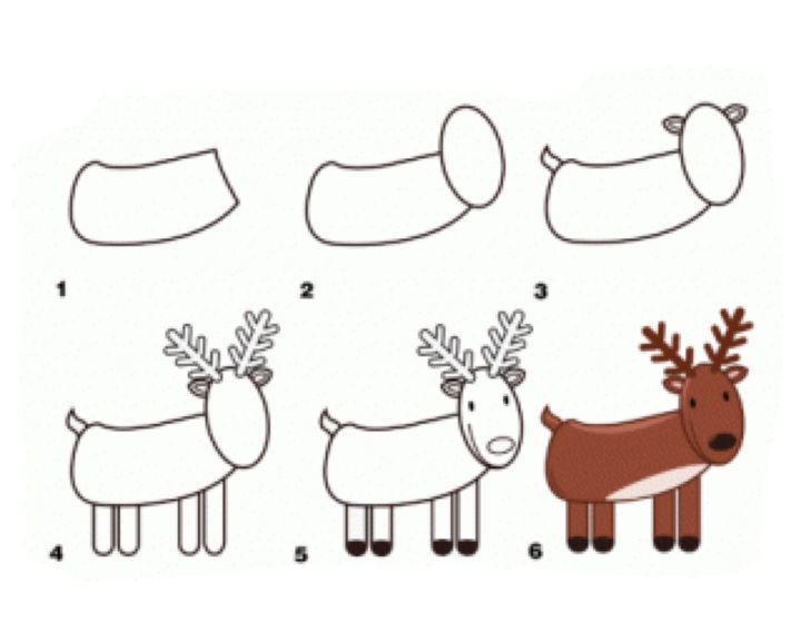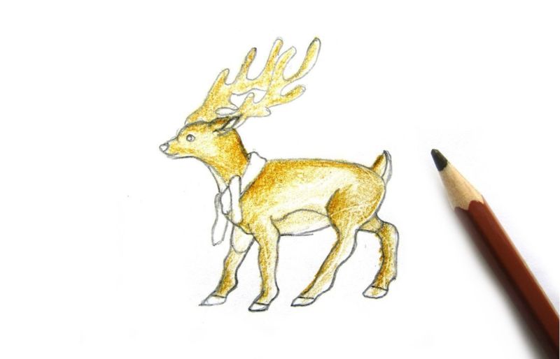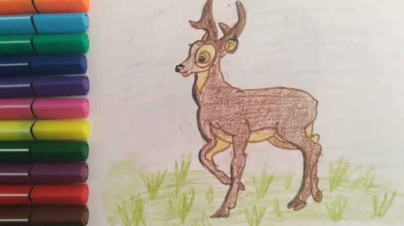 Светлокафяво, за да нарисувате корема, като го притискате по-силно. Със същия цвят е нарисувана малка долна част в близост до ушите. Тъмнокафяво за останалите уши, муцуната (отстрани цветът да е по-тъмен), лапите и копитата. Боядисайте рогата в черно.