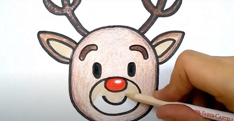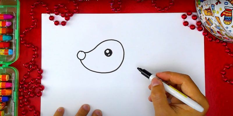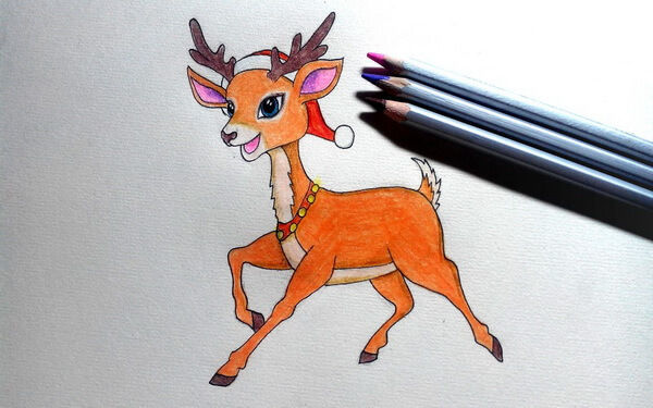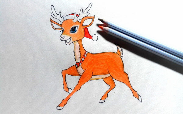 Начертайте всички линии с черна гел писалка. Използвайте го, за да нарисувате носа, очите и копитата. Боядисайте шапката в червено. Оранжево за вътрешната страна на ухото и шала.