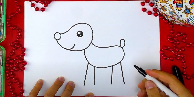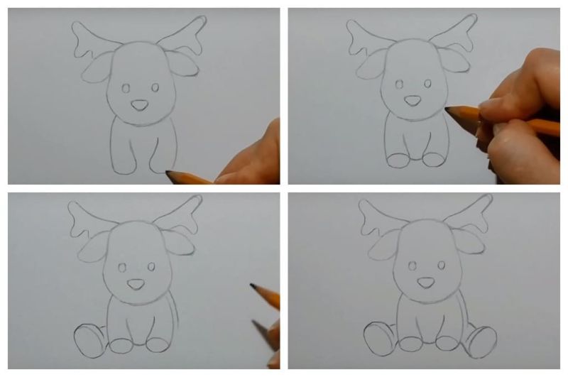 Непосредствено от долната част на главата начертаваме два крака с дължина, равна на тази на главата. Копитата също добавят. Между лапите е изобразена извитата линия на корема. Не забравяйте и за задните крака.