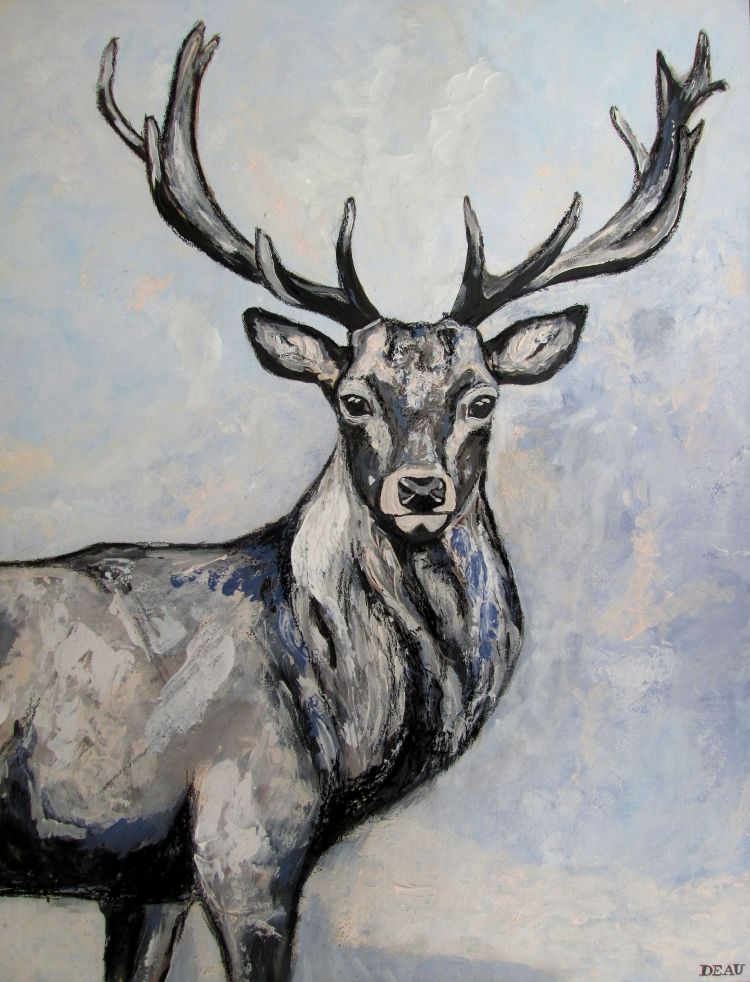 Северните елени ще бъдат в седнало положение. Около него ще летят малки снежинки.