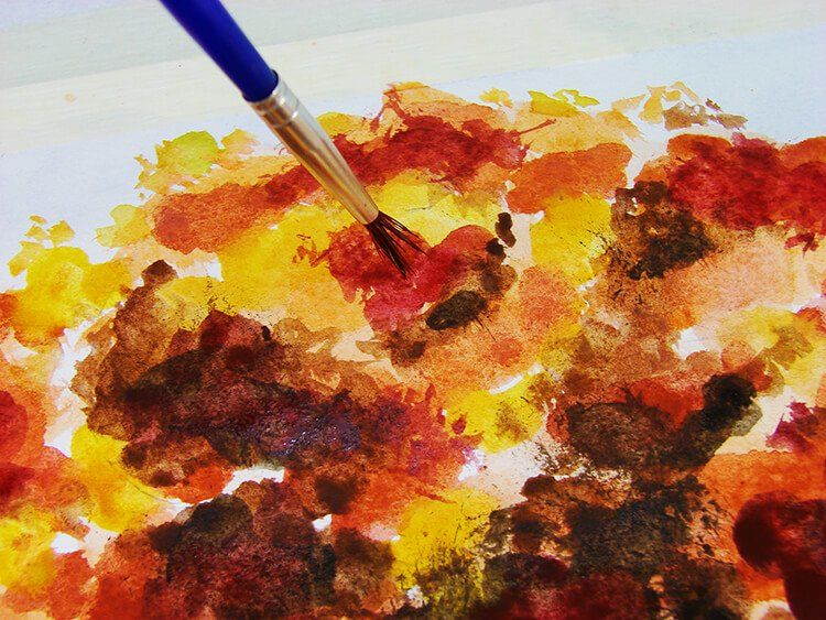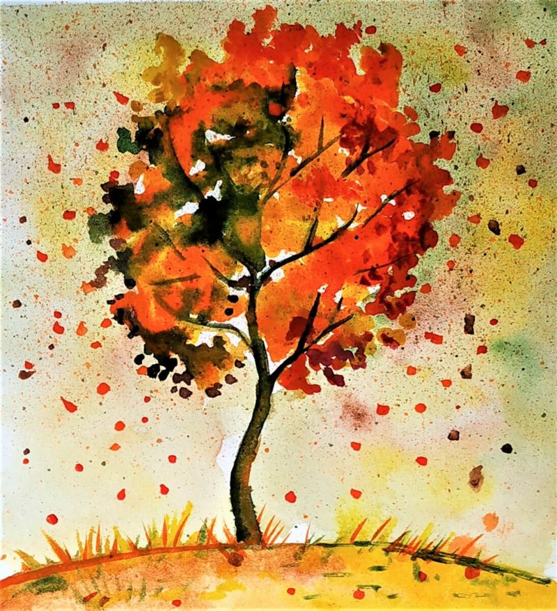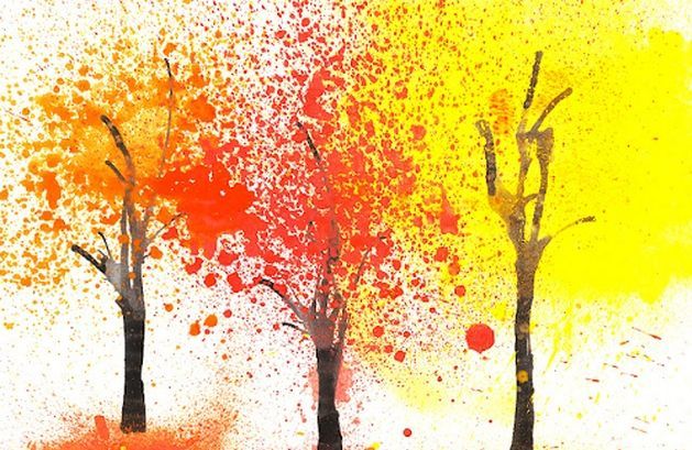 В тази техника ще се опитаме да нарисуваме есенно дърво. Голямо (оранжево) петно се поставя върху лист хартия. Продухайте епруветката (която е непокътната) и петното ще остави ивица пред епруветката. Ако обърнете листа и отново духнете в тръбичката, стъблата ще се разклонят.