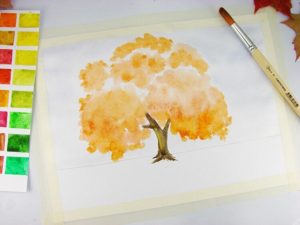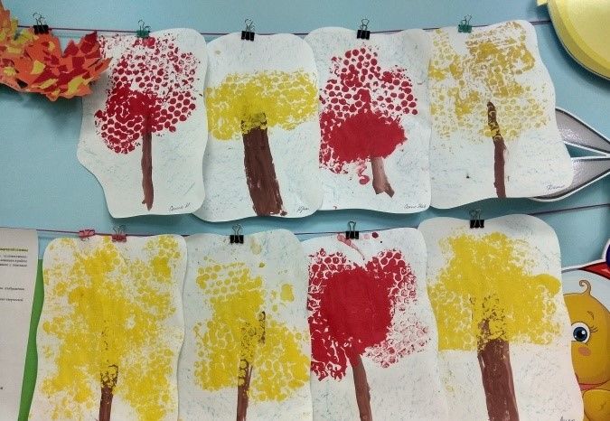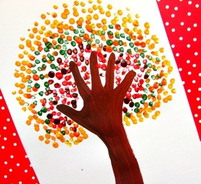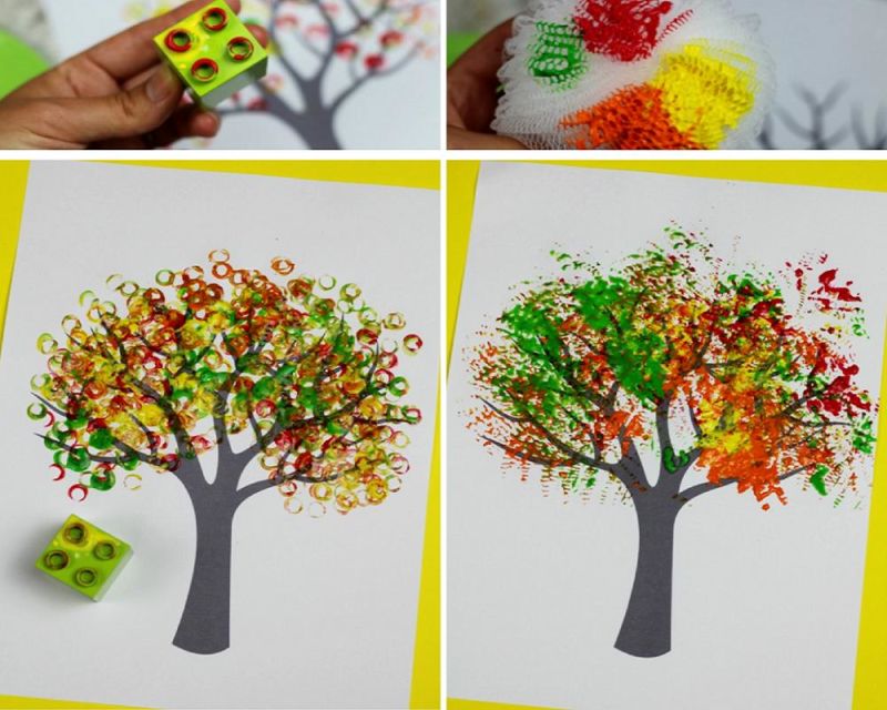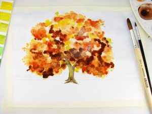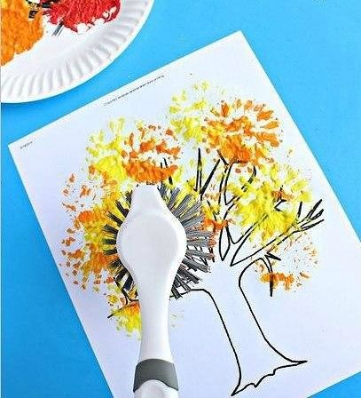 С четината на няколко места правим отпечатъци върху дърветата, като по този начин им придаваме богата многоцветна корона. Всички дървета са украсени. Готов есенен пейзаж.
