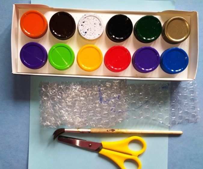 Един необичаен метод за рисуване ми хрумна, след като получих зарядно за телефон, увито в балонче. Както вече сте се досетили, ще ни трябват фолио от балончета, гваш за рисуване, четка, ножица, кафяв молив и лист хартия, по възможност цветен.