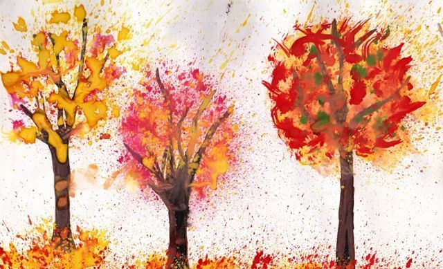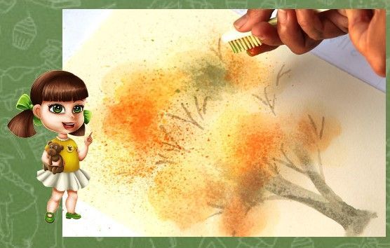Всъщност тази техника е лесна за прилагане, но много интересна. Вземаме четка за зъби, акварелни бои, бурканче с вода, кафяв флумастер и бял или светложълт лист хартия. Започнете да рисувате стволовете на дърветата с кафяв флумастер и веднага ги оцветете.