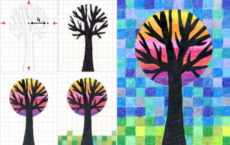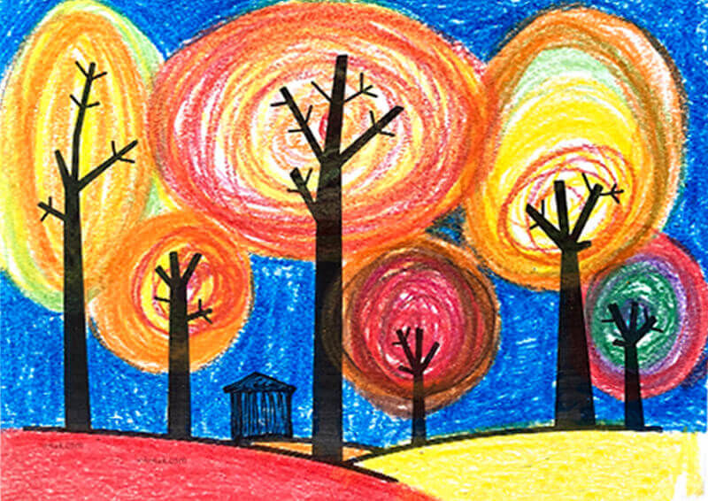 Стволът на двете вертикални прави линии е лесен за начертаване. Горната част на дървото, т.е. короната, се рисува с кръгла вълнообразна линия, като се очертават овали с неправилна форма. Оцветете рисунката с цветни моливи с преобладаващи "златни есенни цветове".
