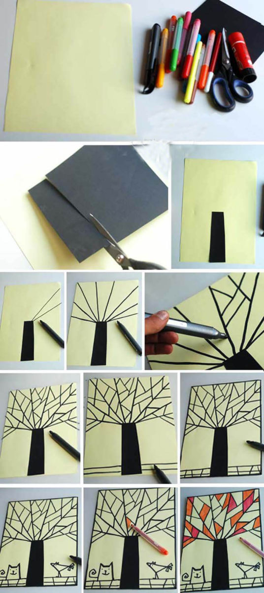 Нарисувайте стволовете на дърветата с молив. Оцветете стволовете с боя или молив. Изрежете овали, кръгове и дори триъгълници от лентата. Нанесете различни цветове гваш върху изпъкналите кръгове.