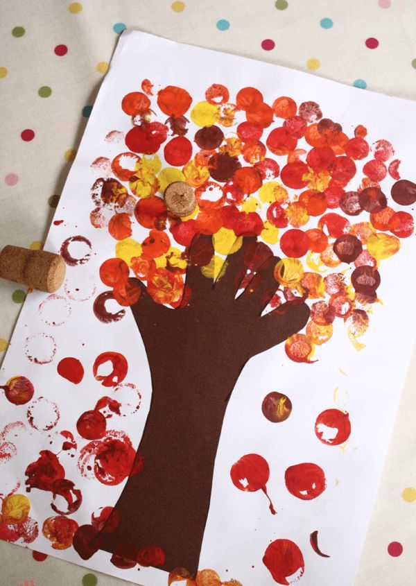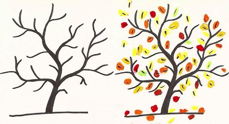 Сега поставете горната част на дървото върху ствола. Те се предлагат в различни цветове и размери. За предпочитане е жълто или оранжево, тъй като рисуваме есента. Оригиналната картина е готова!