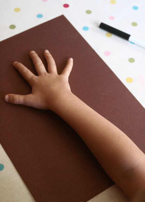 Трябва да използвате кафява боя, за да украсите дланите на детето си. Трябва да направите това внимателно, за да бъде отпечатъкът красив и ясен. Поставете ръцете върху хартията и направете отпечатък. Можете също така да изрежете длан от цветна хартия.