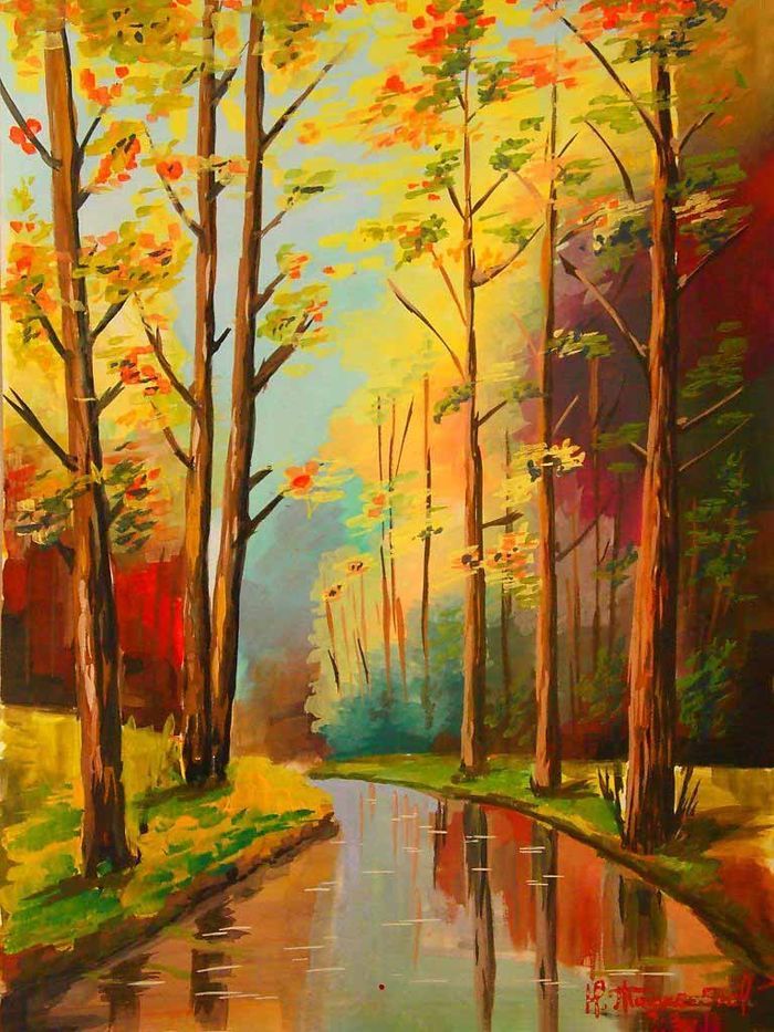 Добавяне на дърво. Пренесете отражението му във водата. Ако желаете, можете да нарисувате няколко дървета. Попълнете короните на дърветата с ярки оранжеви цветове. Отражение във водата в по-малко наситени нюанси на същите цветове.