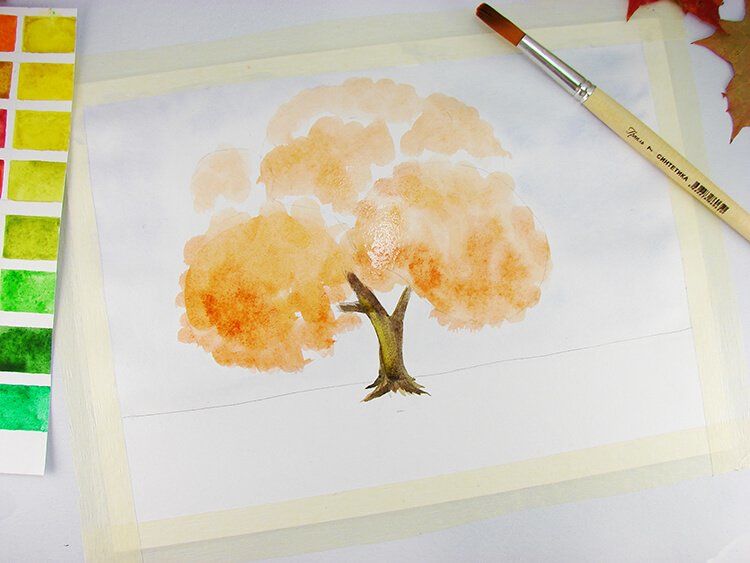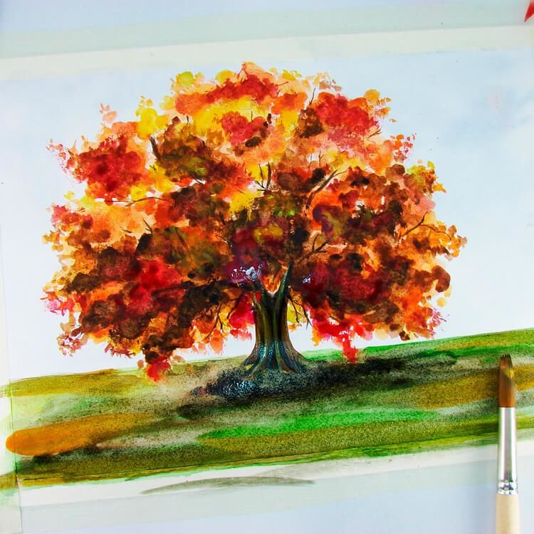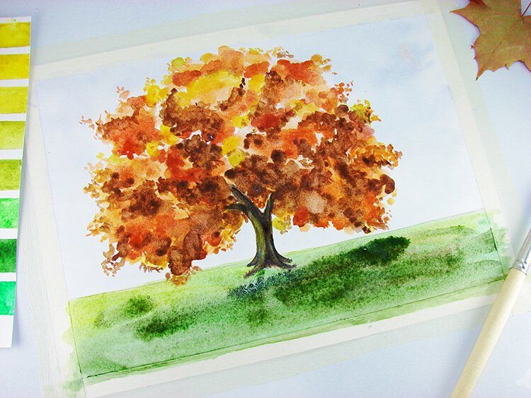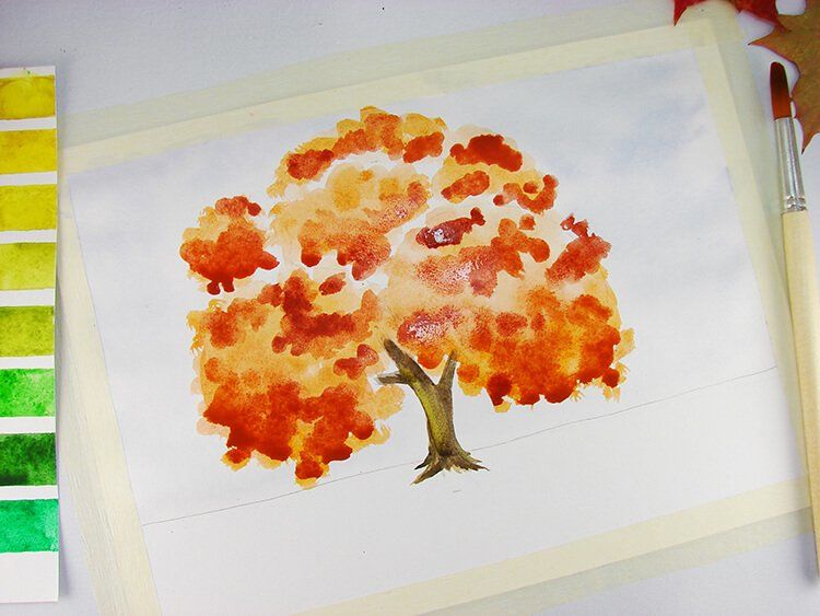 Под дървото можете да нарисувате малка купчина паднали листа, както и листа, падащи на земята.