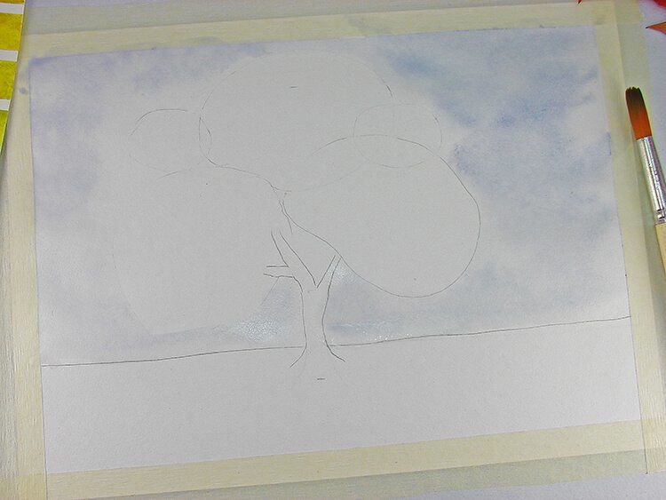 Подгответе гваш, акварелна хартия и четки. По същия начин, както при предишната техника, очертайте линия в средата на листа, но с боя. Горната част на хартиения лист с четка е тъмносиня. Това ще е небето. Могат да се добавят бели облаци.