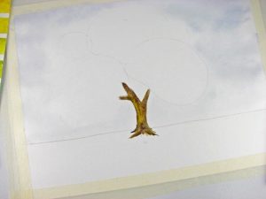 Пропускаме някои от тях и оставяме белия лист небоядисан. Резултатът е розови облаци и вечерно небе. Нарисувайте с кафяв цвят земната повърхност в долната част на листа. Нарисувайте стволовете на дърветата с кафява четка и след това работете върху пръчките.