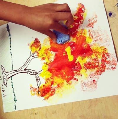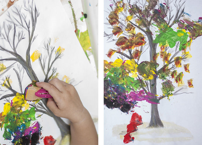 Опитайте се да навлажните гъбата обилно, за да остави по-добър отпечатък върху хартията. Прехвърлете различно оцветените дървета върху листа. Имате хубава есенна гора. Можете да нанесете с четка небето и пожълтялата трева.