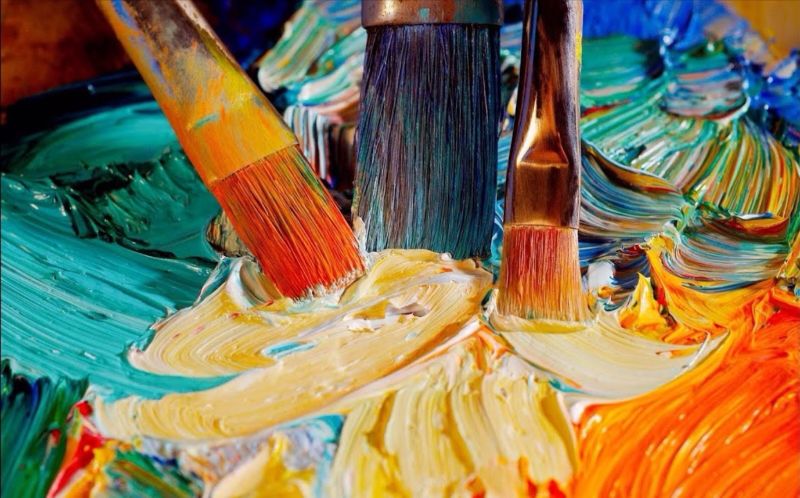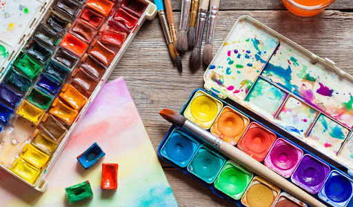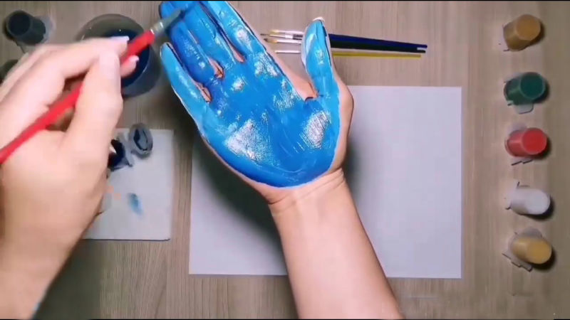 Започваме. Вземете четка и я потопете в тъмносин гваш, след което я нанесете върху дясната ръка. Изрисувайте цялата длан. Потопете четката в буркана с вода и я разбъркайте, за да се отървете от синия цвят. Натопете четка в бяла боя и я нанесете върху предишния слой.