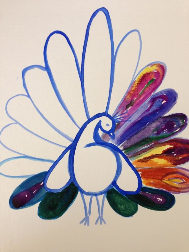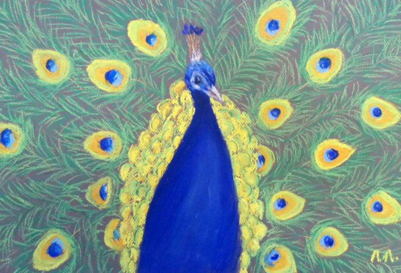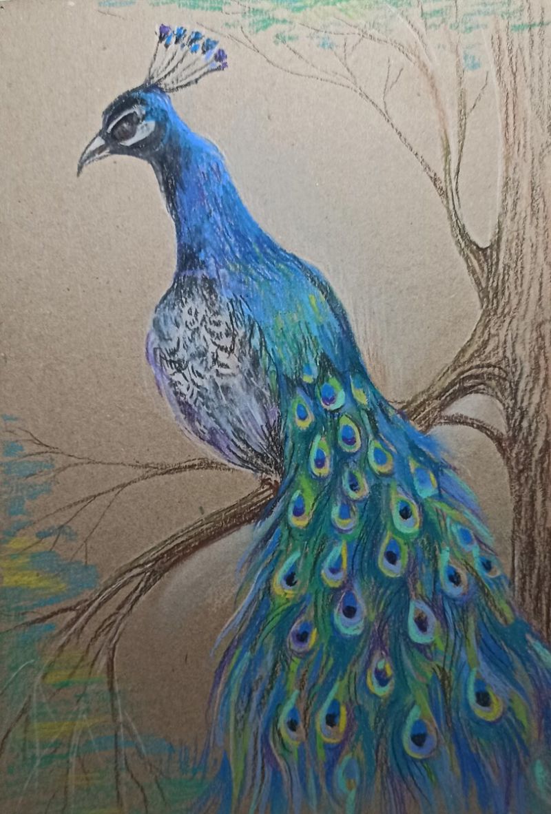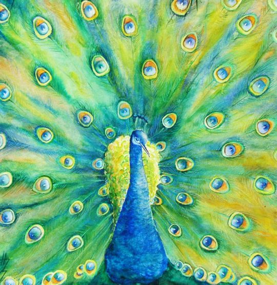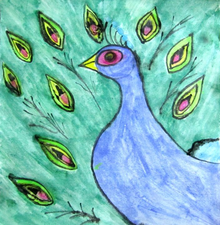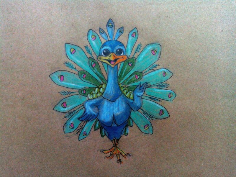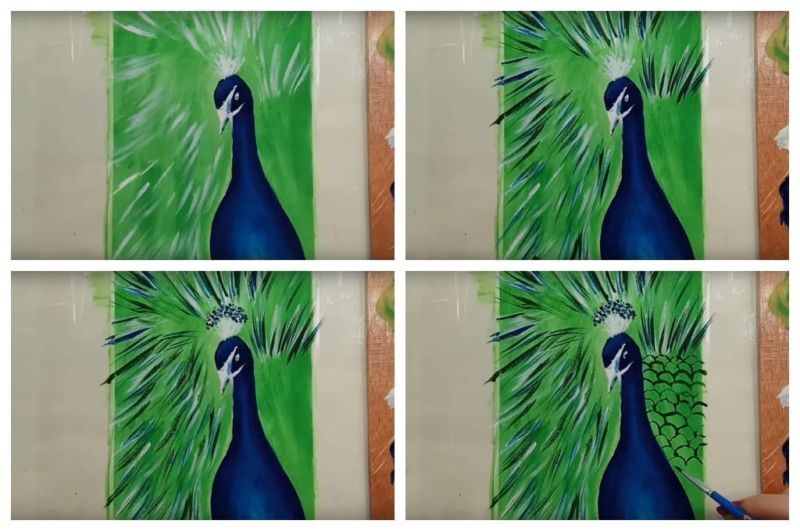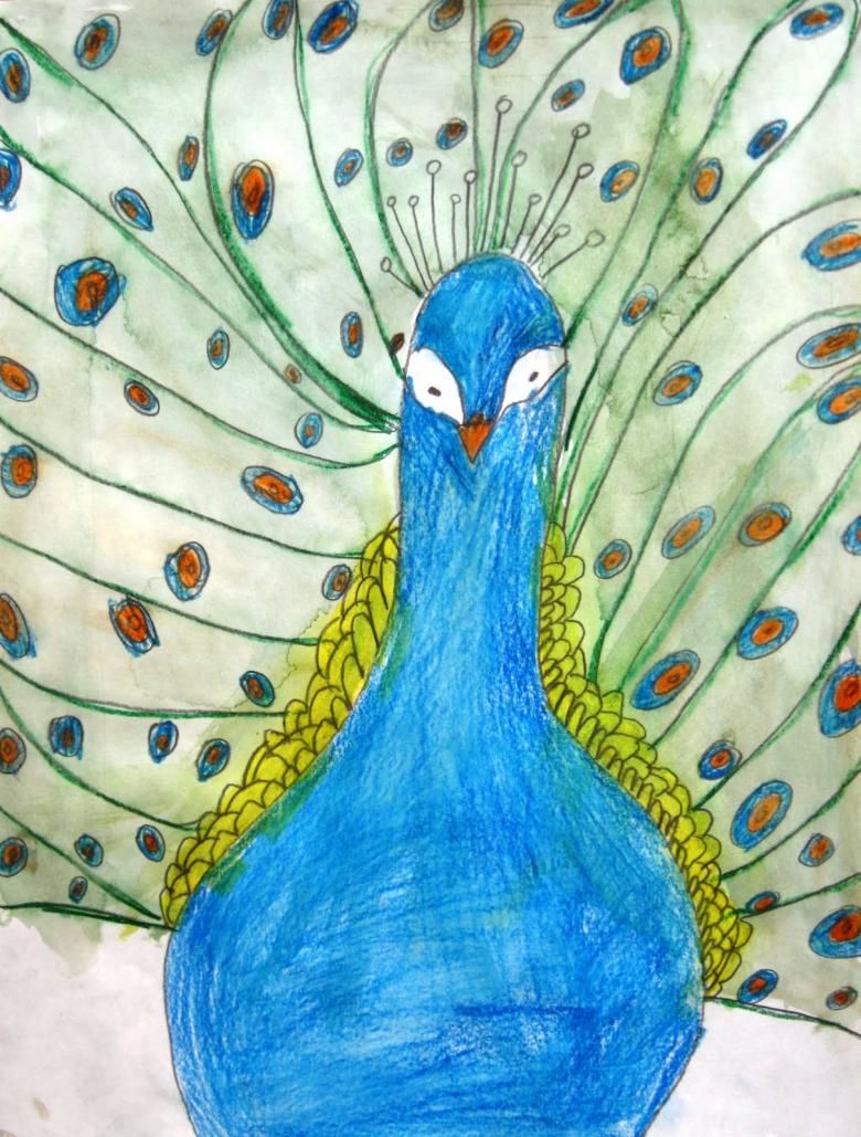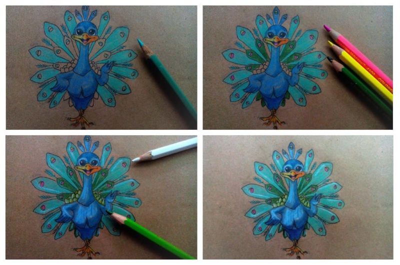 "Маска" в жълто на главата на пауна. В светлолилаво леко нарисувайте линии по цялото тяло. Зелено за шията и по-слабо оцветените части на тялото. Нарисувайте със синя боя пролуките в тялото на пауна. Нарисувайте сенки върху шията с черен молив.