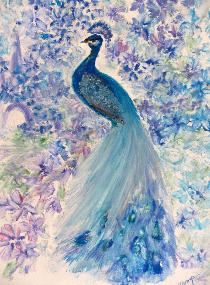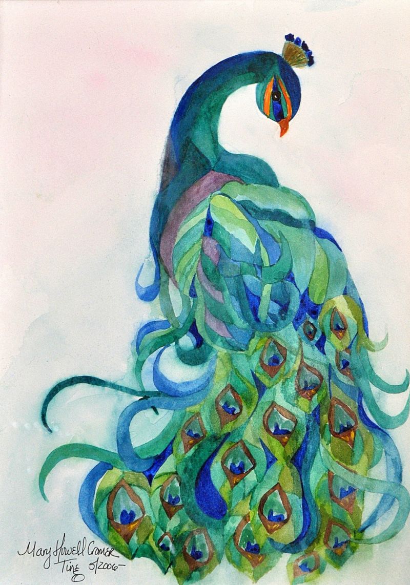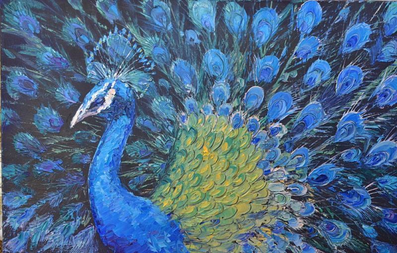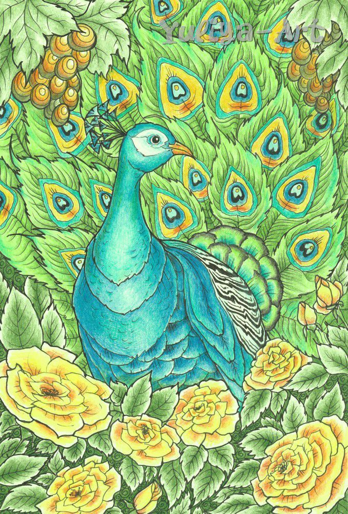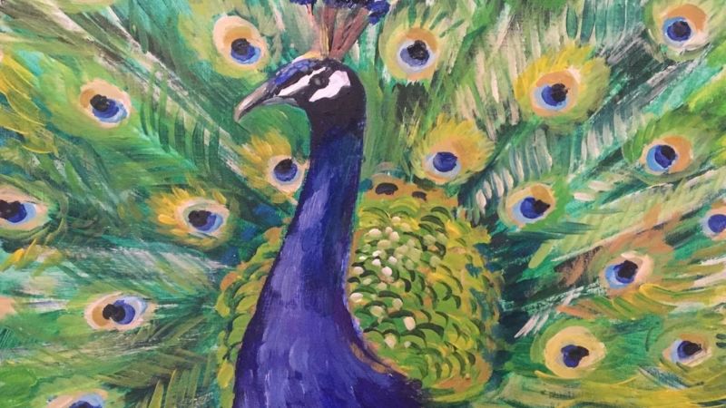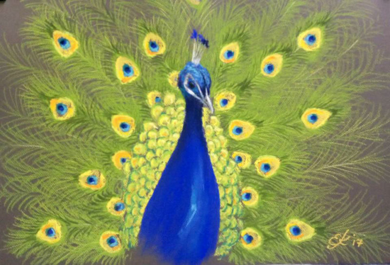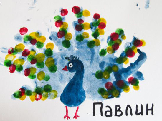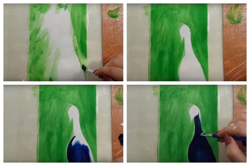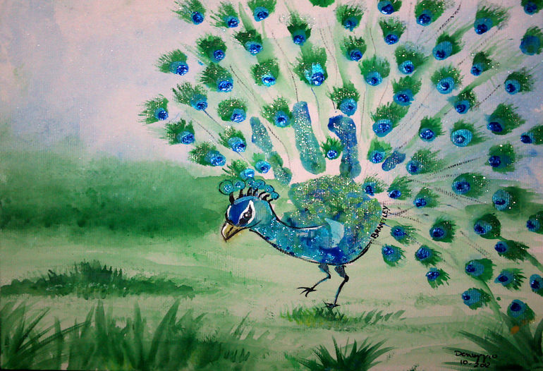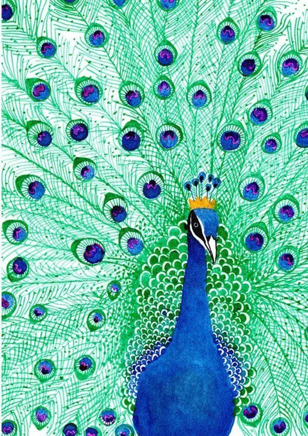 "Маска" в жълто на главата на пауна. В светлолилаво леко нарисувайте линии по цялото тяло. Зелено за шията и по-слабо оцветените части на тялото. Нарисувайте със синя боя пролуките в тялото на пауна. Нарисувайте сенки върху шията с черен молив.