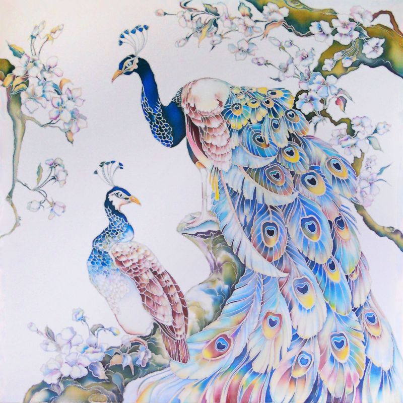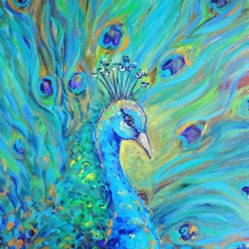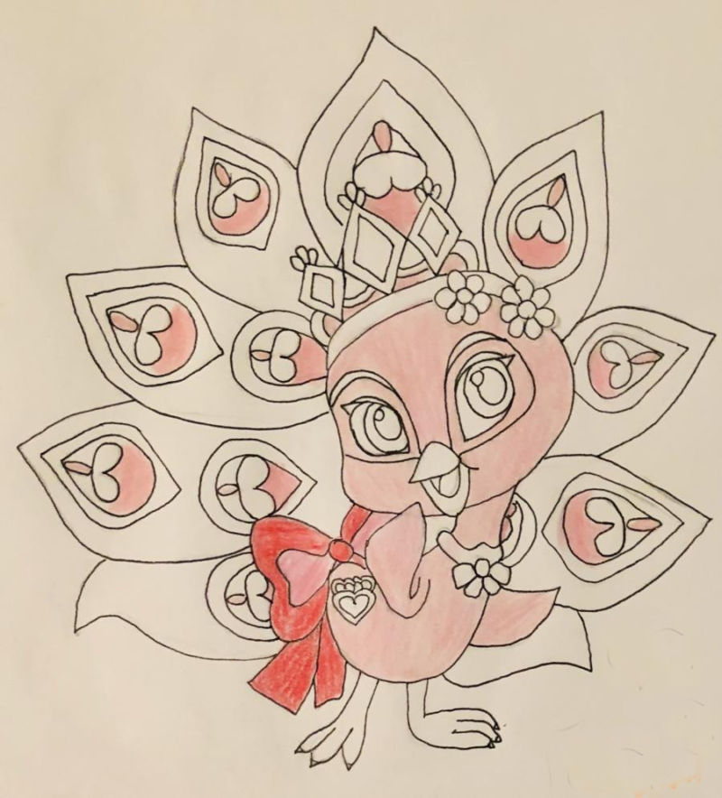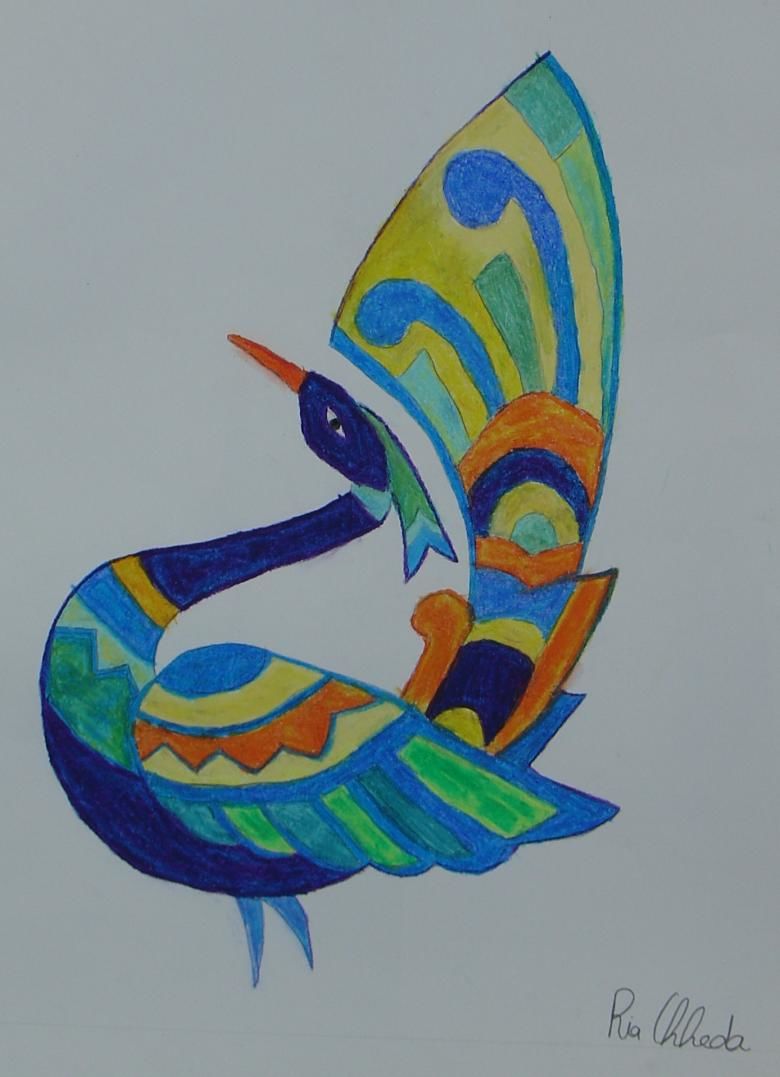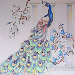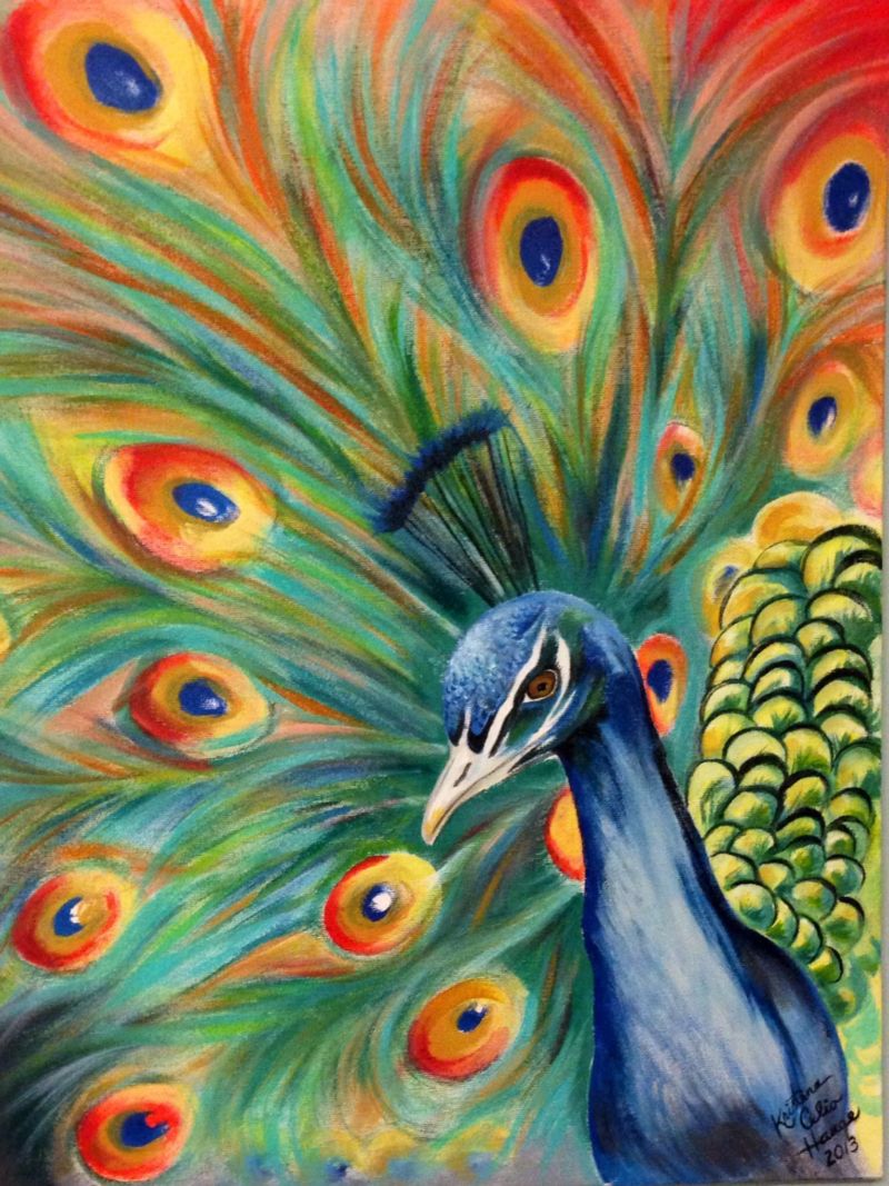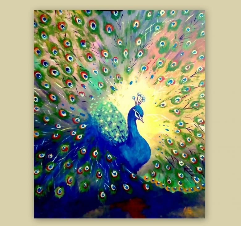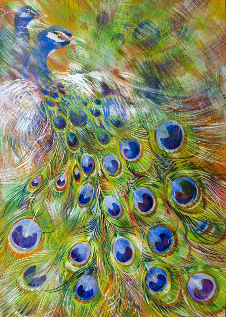 "Маска" в жълто на главата на пауна. В светлолилаво леко нарисувайте линии по цялото тяло. Зелено за шията и по-слабо оцветените части на тялото. Нарисувайте със синя боя пролуките в тялото на пауна. Нарисувайте сенки върху шията с черен молив.