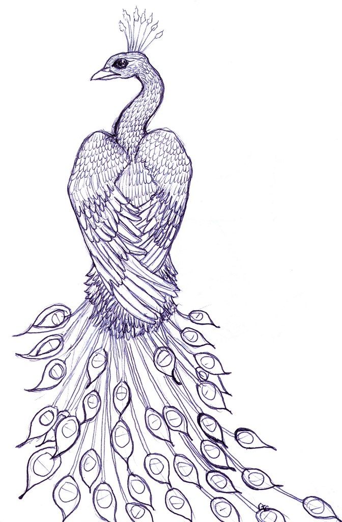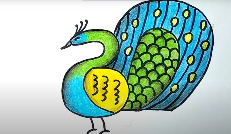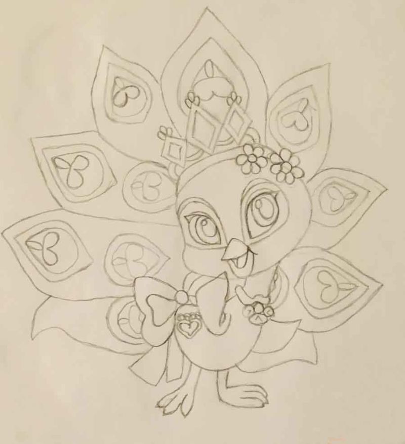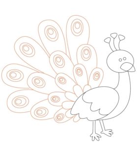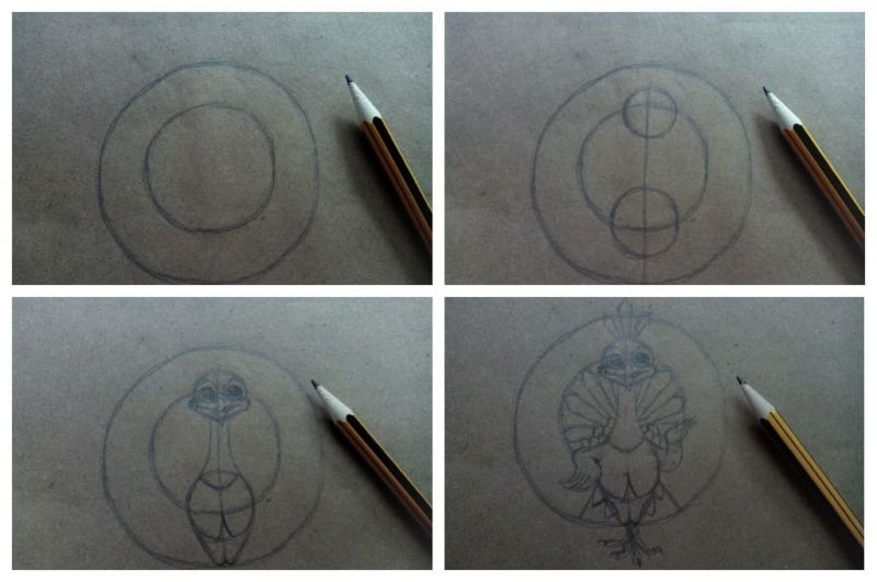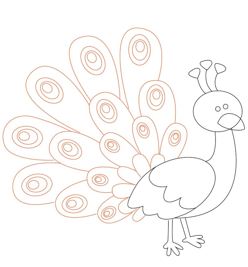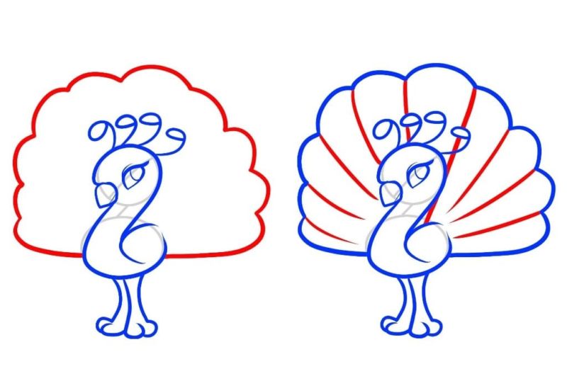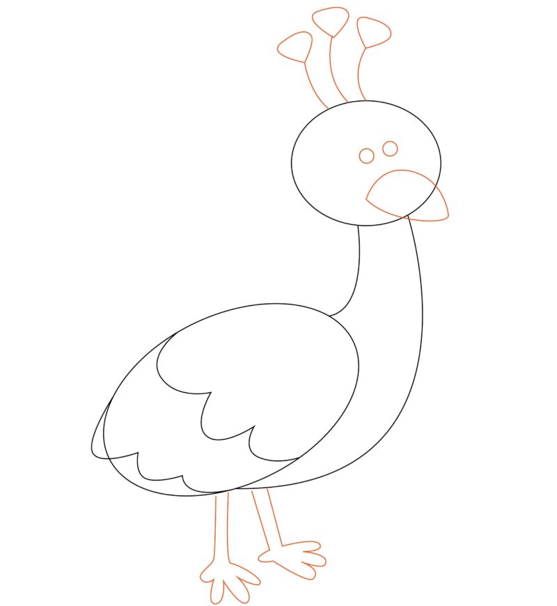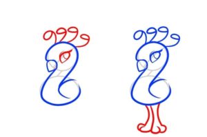 От долната част на тялото се подават два крака. Свържете долната част на фигурата две с паун по права линия. Свържете горната част на двете с торса. От шията до върха на двете нарисувайте полуовал. В по-малък овал нарисува пера.