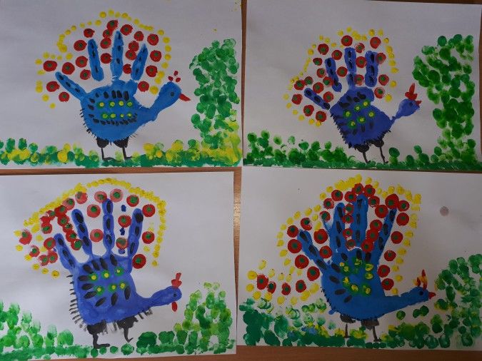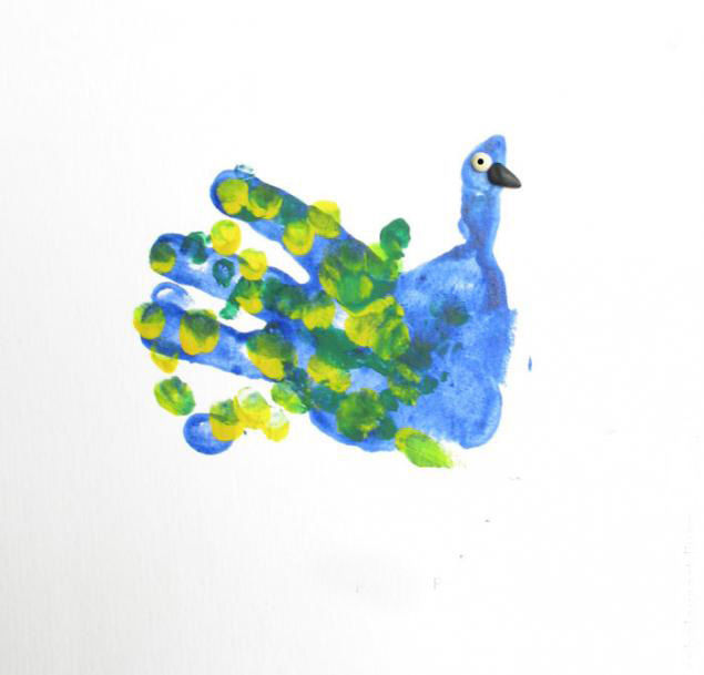 Със синьо нарисувайте малки кръгове по върховете на перата отдолу. Те са в голям жълт кръг. Оцветете с оранжев цвят белите остатъци от кръга. Използвайте тъмнозелен нюанс, за да придадете повече обем на перата. С оранжев цвят очертайте "краката" на перата с дръжки. Рисунката е готова.
