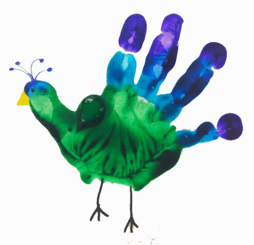 Нанесете този цвят под горните пръсти и в средата на дланта. Вземете лилаво и го използвайте за четири кръга на всеки горен пръст. С по-фина четка и същия нюанс нарисувайте линии върху главата на пауна, които в краищата се навиват на руло.