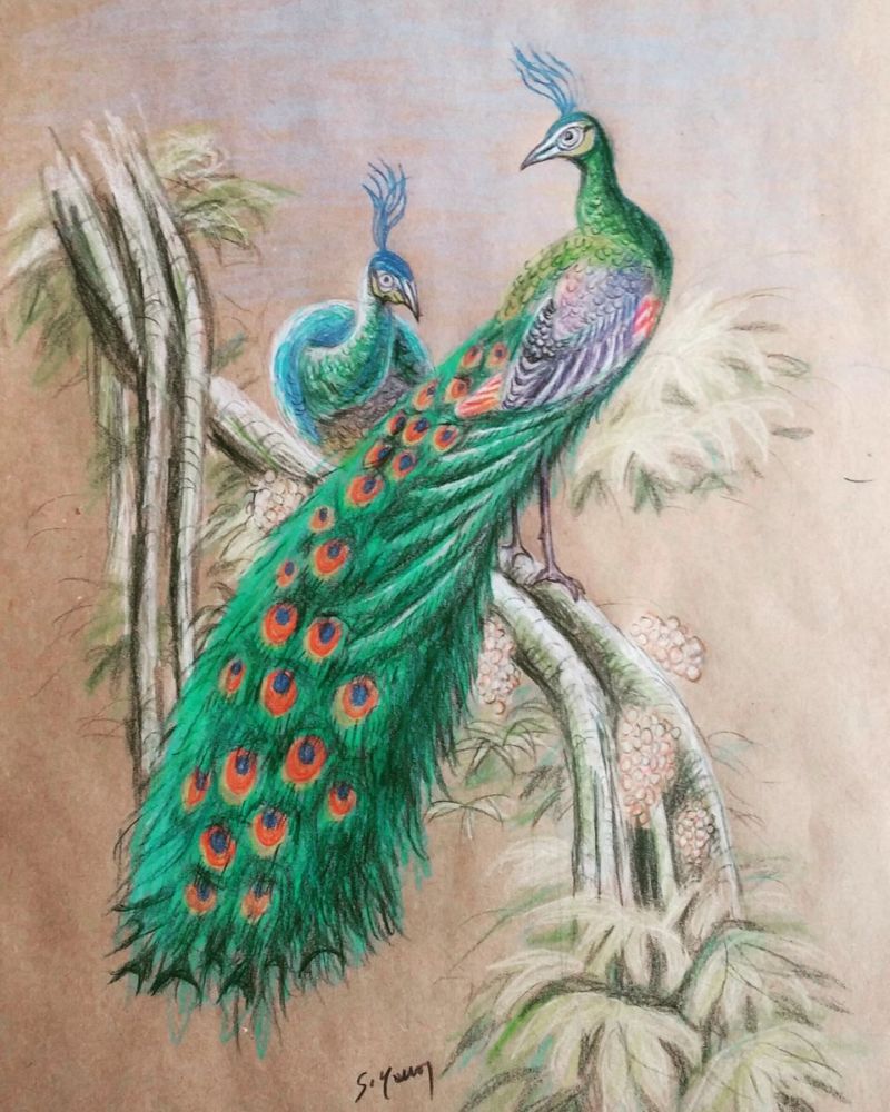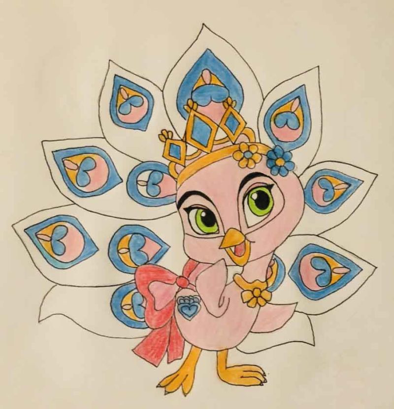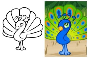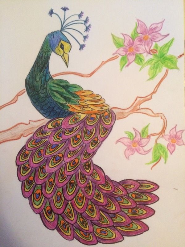 Краката приличат на панталони, последвани от тънки крака. Паунът седи на голямо клонче от дърво, което в края се превръща в две клончета. От клоните се изтеглят листа. Готова рисунка с молив, ако искате, можете да я нарисувате.