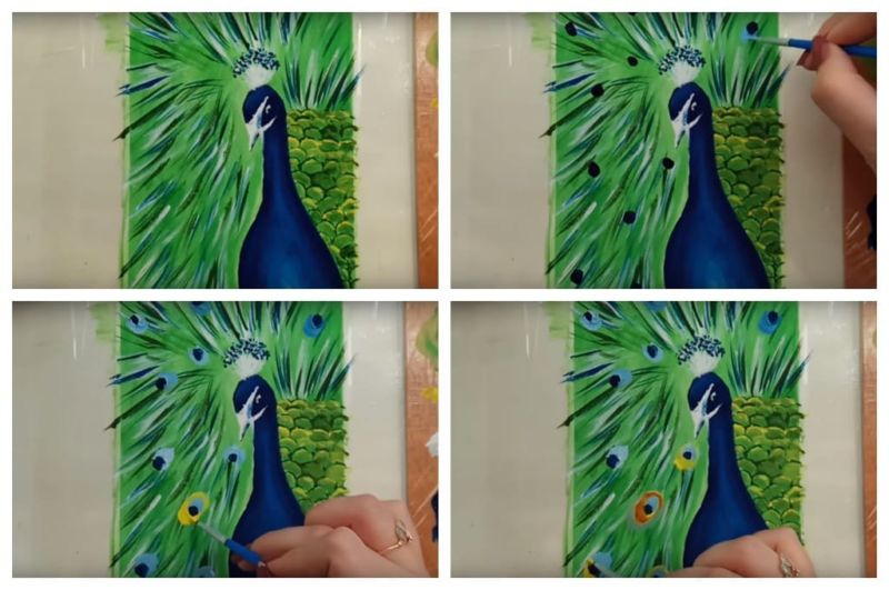 Започваме с жълто. Използва се за изрисуване на кръговете в края на перата, от които също излизат малки влакна, както и по цялото перо. Използвайте същия цвят, за да очертаете овалите на гърба. Подчертаваме ги със зелено и добавяме този цвят върху всички пера.