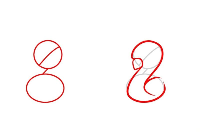 Започваме с маркера. С него се рисува клюн с триъгълна форма. От нея се очертава линия. Първо, очертаваме заоблената форма на главата и врата. Изтегляйки малко по-малко от един сантиметър от шията надолу, рисуваме "охлюв", чийто връх стига до клюна. Всички заедно имат форма, подобна на числото осем. Преминаваме към окото.