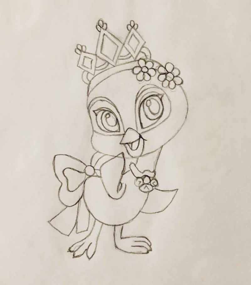 Белият лист е подреден вертикално. Започнете с лилав цвят. Начертайте с него кръг, който не е затворен в горната си част. След това добавяме врата. Линиите ѝ се простират от кръга до върха. Начертайте кръг, по-малък от първия, върху шията. Вземаме оранжев цвят и рисуваме човка, която е насочена напред, към нас. Нарисувайте го отвътре.