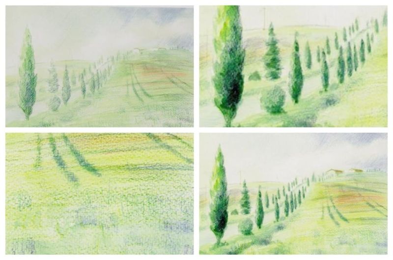 - Използвайте цветни моливи, за да засенчите дърветата със зелено и жълто. Създайте корона, растенията се оцветяват с тъмни пастели, а пътят се проследява със светлозелено.