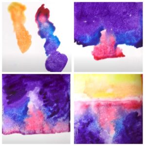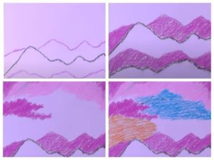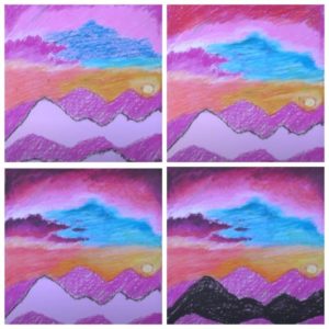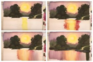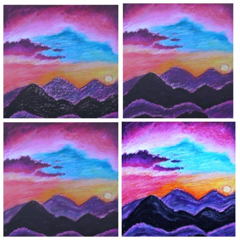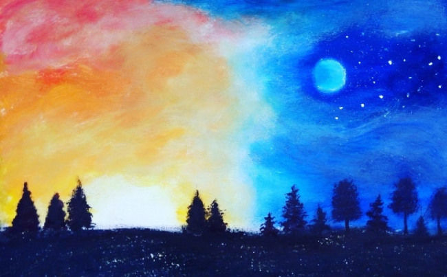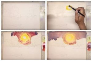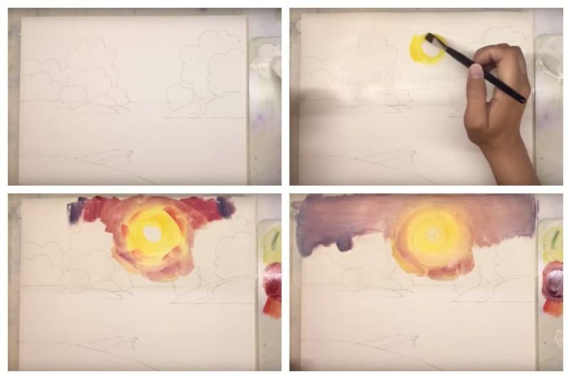 - След работата с молив пристъпете към работа с гваш. Горната половина е покрита с бяла боя, слънцето е нарисувано в жълто, смесено с кафява боя и зоната около слънцето е боядисана, а в горните ъгли е нанесена лилава боя.