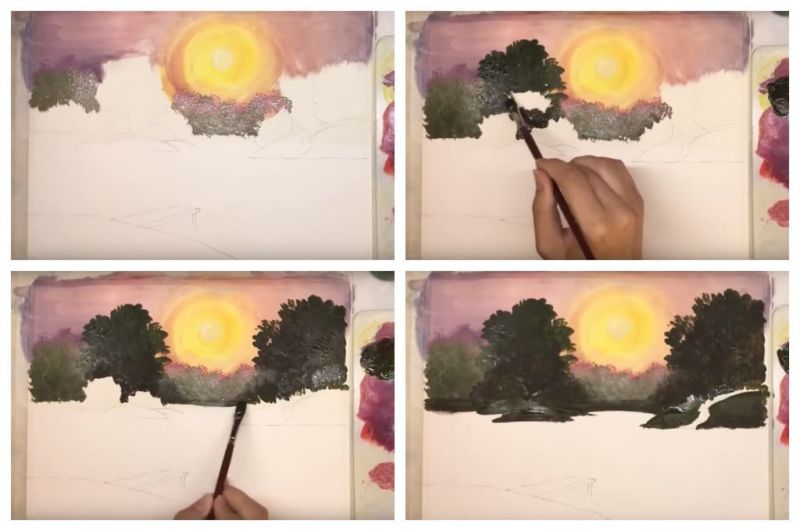 - На преден план е трева, например, може да е тръстика, дърветата се открояват, не е задължително да са еднакви: може да са различни, някъде стволовете на дърветата ще са пречупени, не много прави.