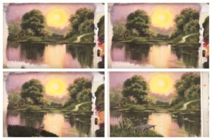 - Тъмнозеленото е смесено с черно, а храстите са детайлни. Извършва се избелване и тревата се изсветлява, по краищата на тревата се нанася жълт цвят и работата е свършена!