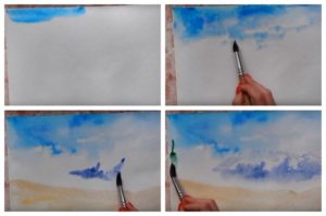 - След като отбележите хоризонта, нарисувайте слънцето и облаците.
