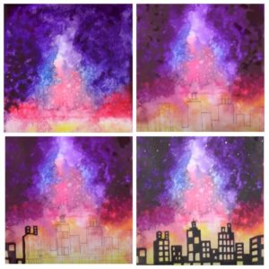 - Върнете листа на мястото му и нанесете лилаво и червено за небето. Оставете да изсъхне, след което боядисайте къщите с прозорци.