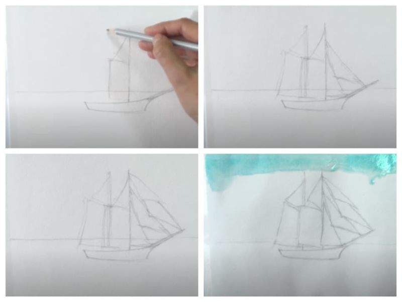 - Както обикновено, първо подчертайте линията на хоризонта, а след това очертанията на платноходката върху нея, което ще създаде впечатлението, че тя плава там далеч.