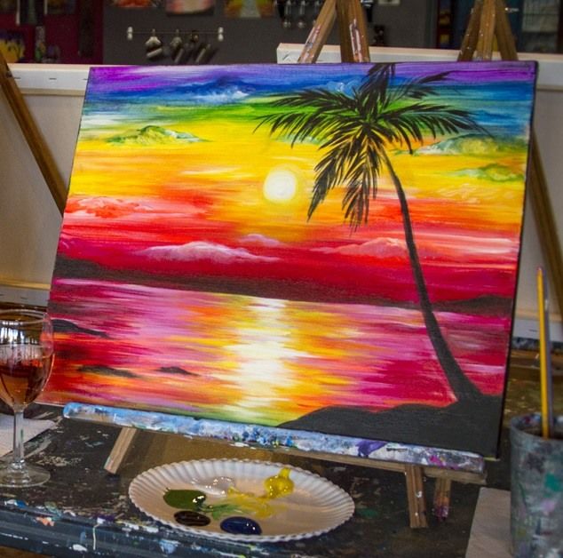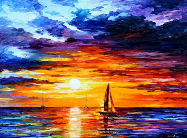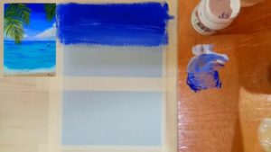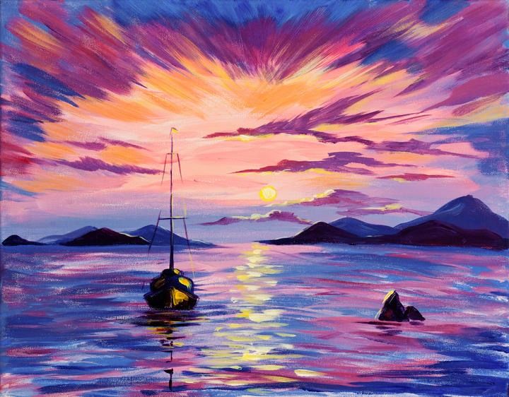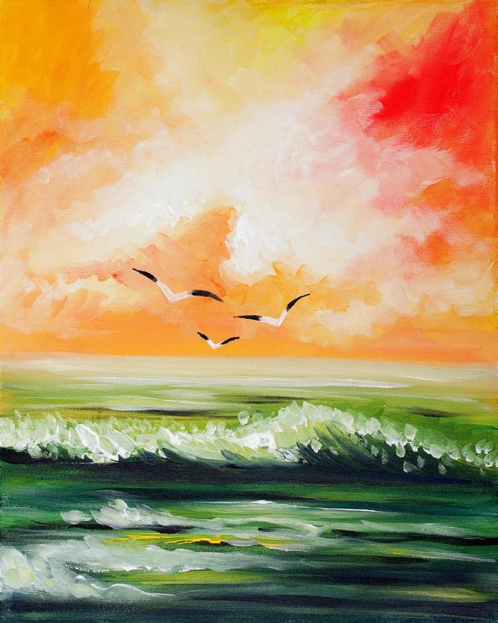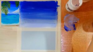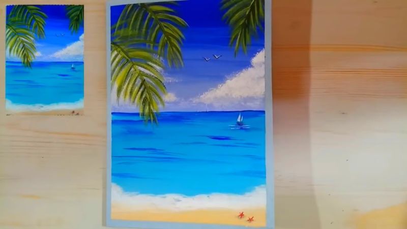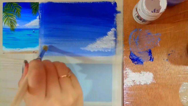 - Белината се нанася чак до дъното, жълтото е нарисувано върху водата, а оранжевото създава отражение на слънцето. Отстрани се нанася кафяво, за да се получи преход между цветовете.
